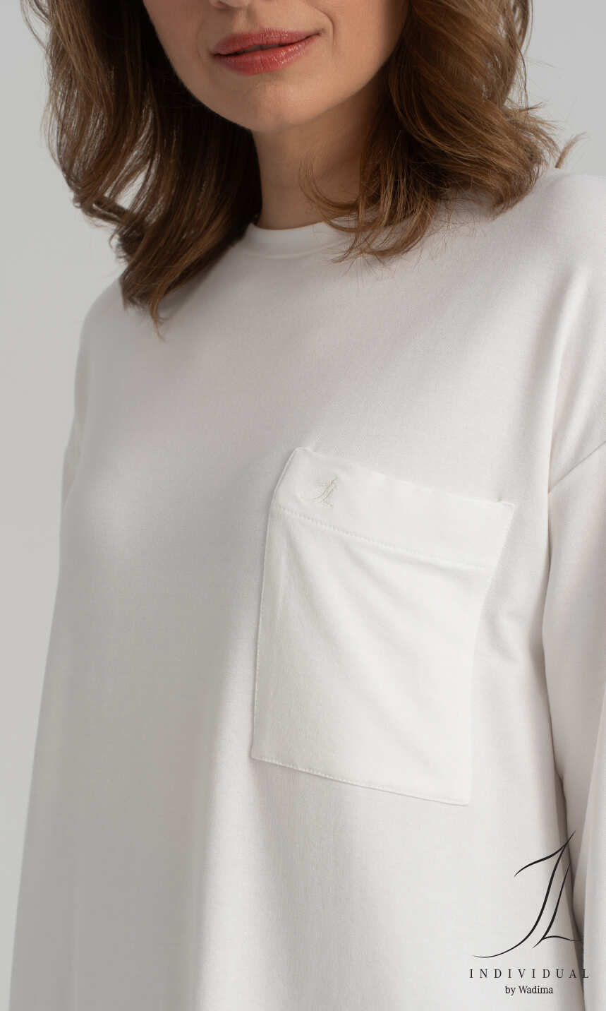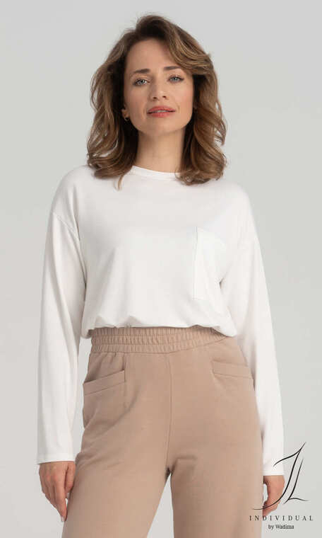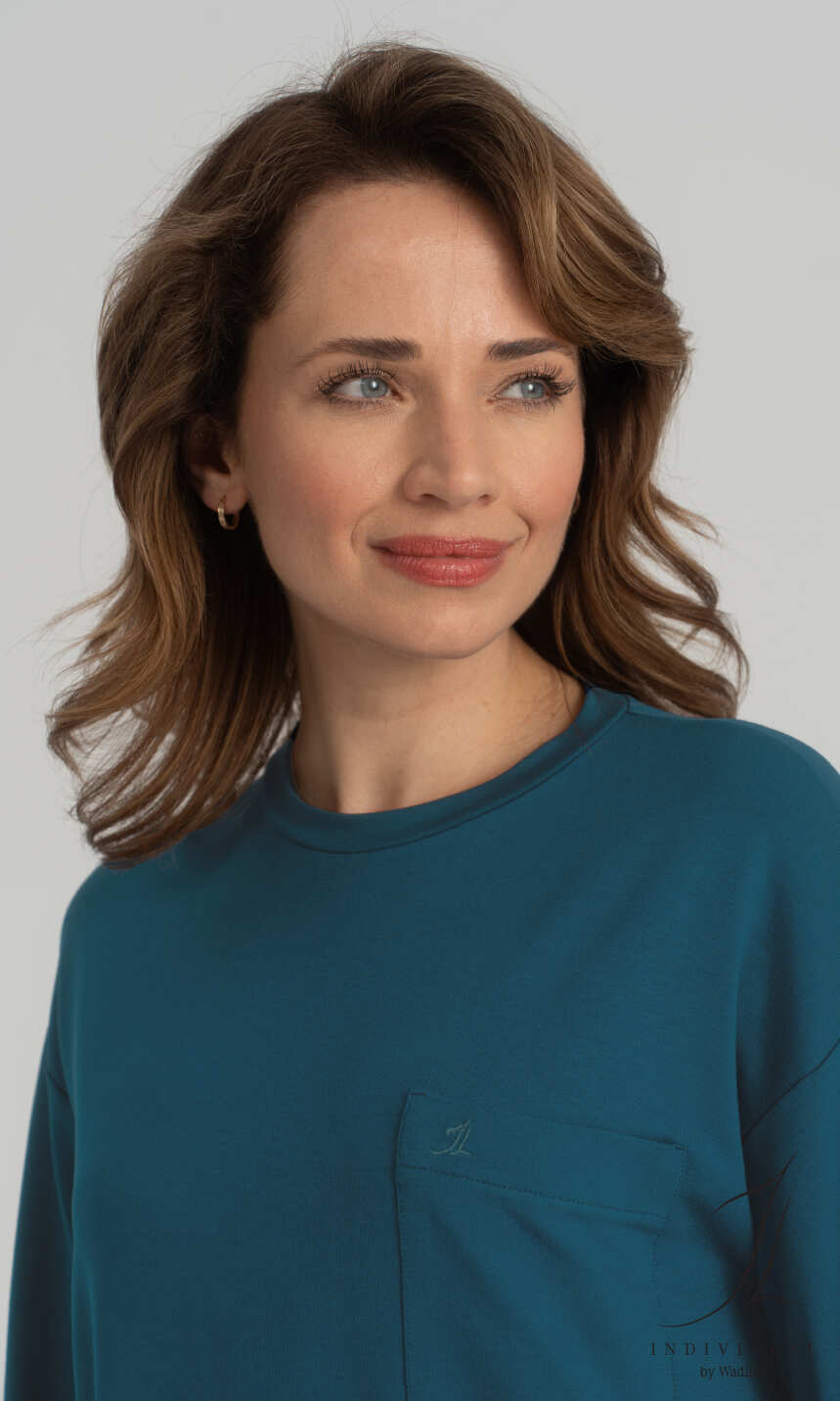 Mały, półokrągły dekolt wykończony wąską plisą z tego samego materiału. Rękaw długi, prosty z tzw. opuszczonym ramieniem, zakończony jak dół bluzy podwinięciem. Z lewej strony, z wyszytym logo firmy INDYWIDUAL by Wadima, praktyczna kieszonka. Bluza w luźnym, sportowym stylu; ładnie komponuje się z szerokimi spodniami 1N113, ale ze zwykłymi, wąskimi dżinsami też wygląda ciekawie.