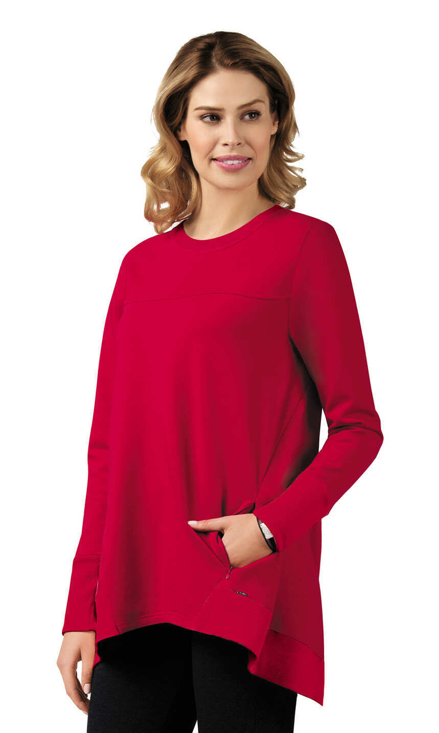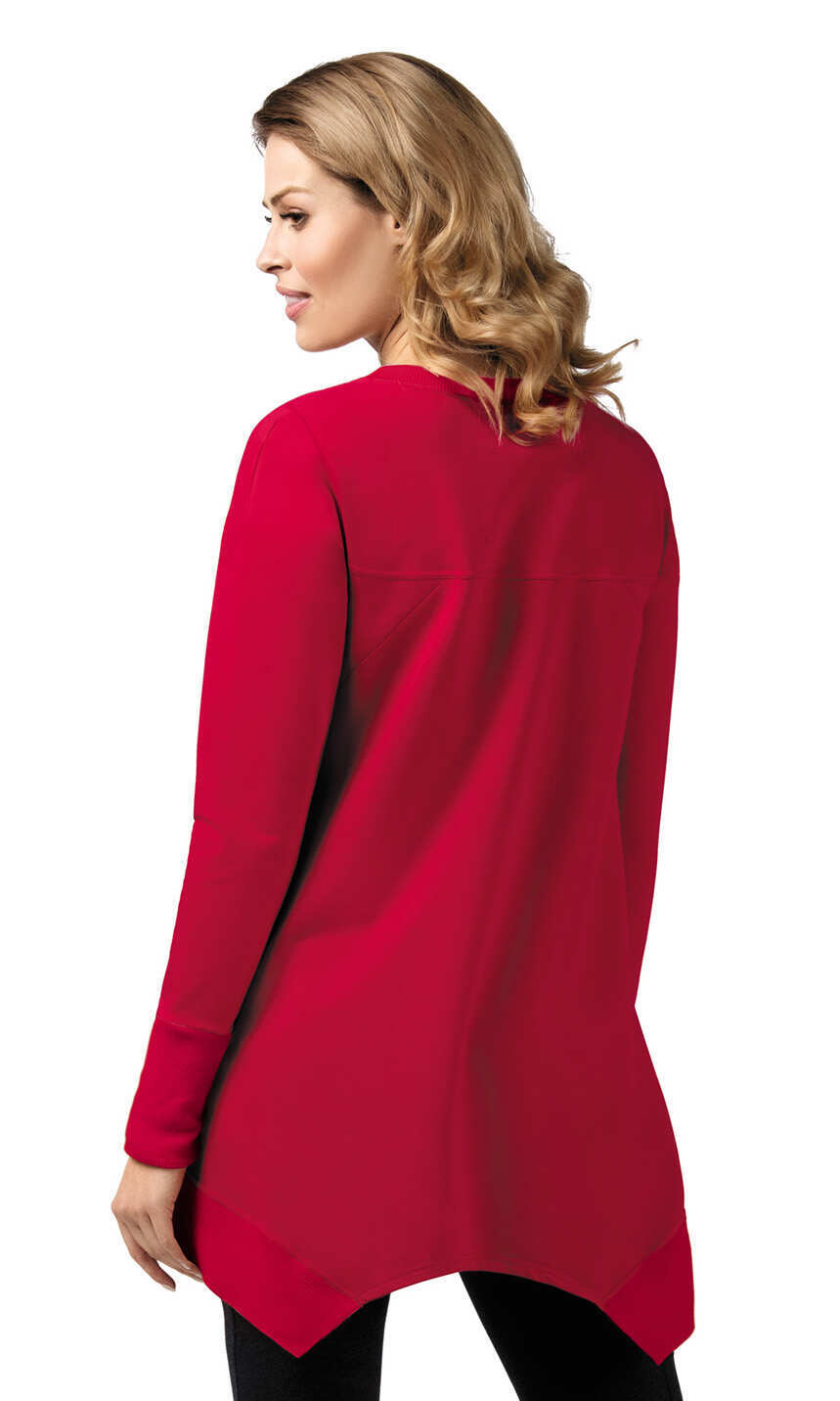 Góra dopasowana do ciała, ku dołowi lekko rozszerzana, luźno puszczona. Półokrągły dekolt wykończony ściągaczową wypustką w tym samym kolorze. Rękawy ładnie zakończone szerokim, ściągaczowym mankietem. Po bokach mało widoczne, z wszytymi na szwie suwakami, wygodne kieszenie. Dół, zarówno z przodu jak i z tyłu, w części środkowej zakończony podwinięciem, po bokach zakończony ściągaczem. Wygodna i praktyczna.