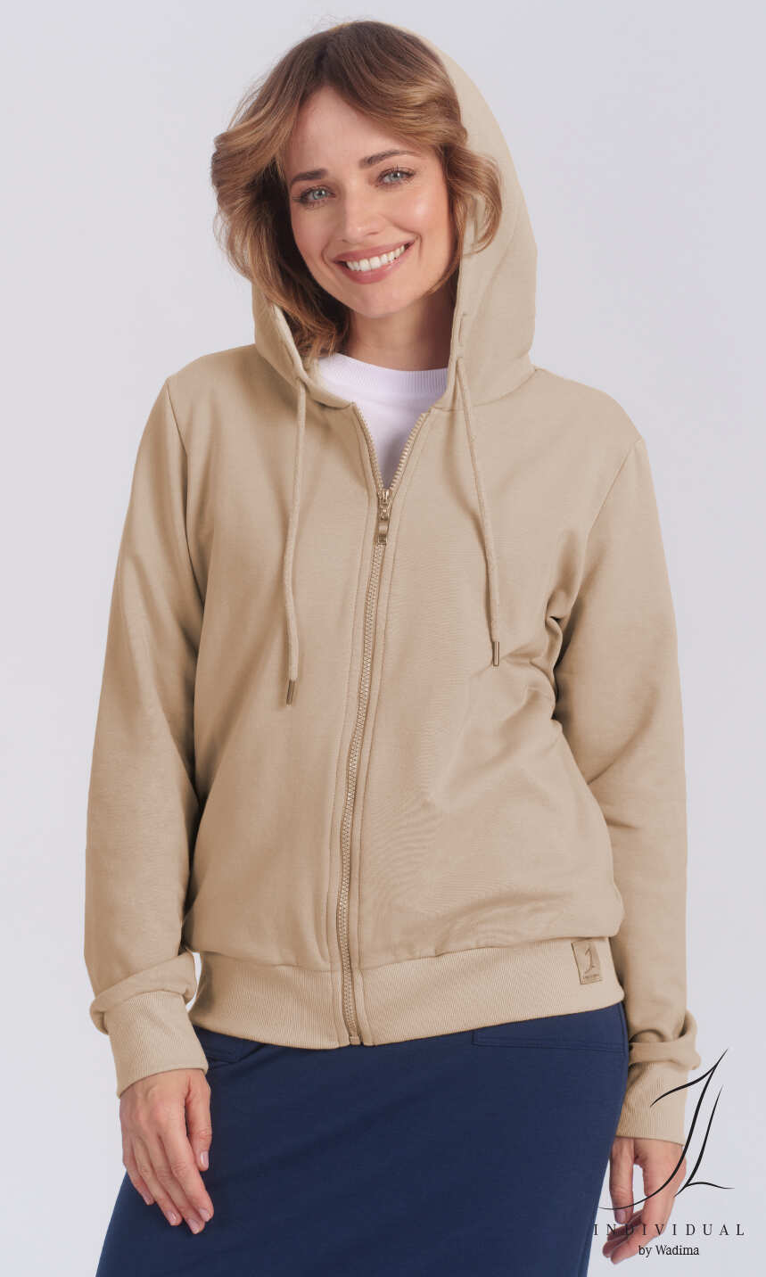 Fason luźny, z kapturem, z zapięciem na suwak po całej długości bluzy. Rękaw wszyty klasycznie, z podkrojem, tak jak dół bluzy zakończony bawełnianym ściągaczem.`Po bokach, na szwie, wygodne kieszenie. Kaptur z wciągniętym w tunel troczkiem w tym samym kolorze. Z długimi spodniami 10131, krótkimi spodenkami 1N105 czy spódnicą 1N544 tworzą bardzo atrakcyjny i wygodny, sportowy komplet damski.