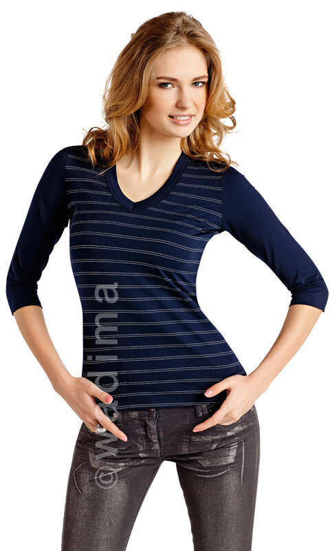 Dekolt w serek wykończony bawełnianą lamówką. Na przodzie bluzki wplecione srebrne, metalizowane nici, tworzące poprzeczne, ozdobne paski. Połączenie wiskozy z elastanem sprawia, że ładnie się układa i dobrze "nosi''. Korzystnie prezentuje się w luźnym, młodzieżowym stylu noszona do spódnicy czy spodni, szczególnie dżinsowych.
