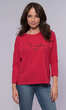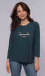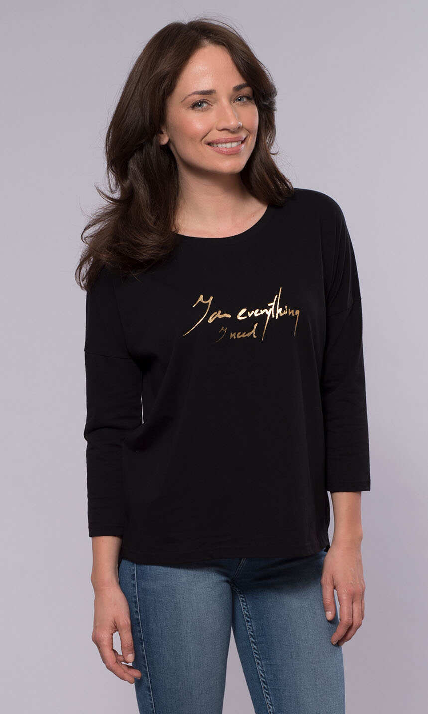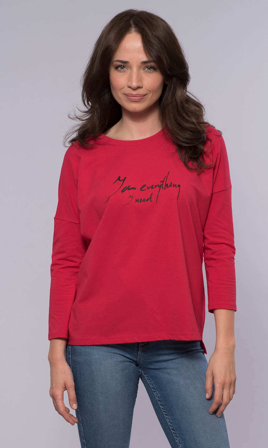 Forma luźna, szeroka, doskonale maskująca wszelkie kobiece fizyczne "nadwyżki". Półokrągły dekolt wykończony ściągaczową wypustką w tym samym kolorze. Na przodzie lekko gumowany, wymowny napis " I am everything I need", czyli "Jestem wszystkim, czego mi trzeba". Rękaw 3/4, doszyty do tzw. opuszczonego mocno ramienia. Dół z dłuższym o 3,5 cm tyłem, wykończony tak jak rękawy podwinięciem. Idealna do zwykłych jeansów, choć ze spódnicą wygląda równie ciekawie.