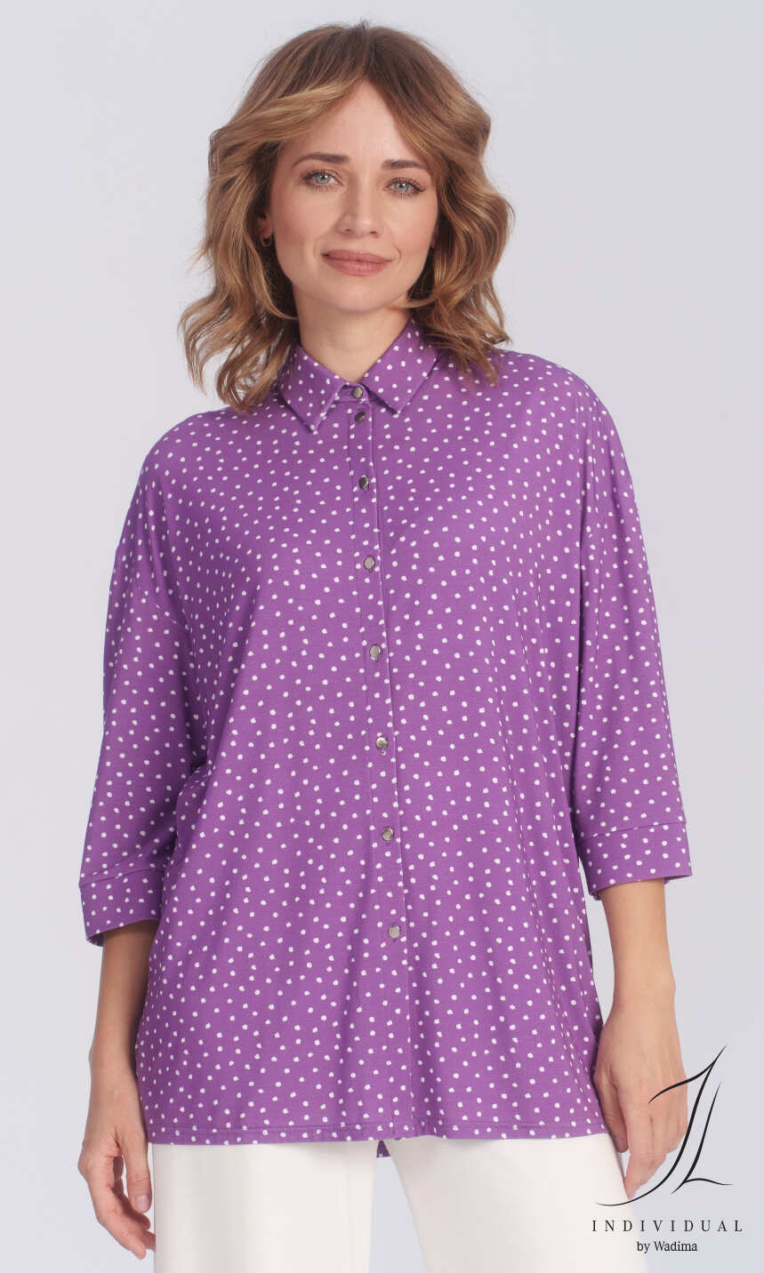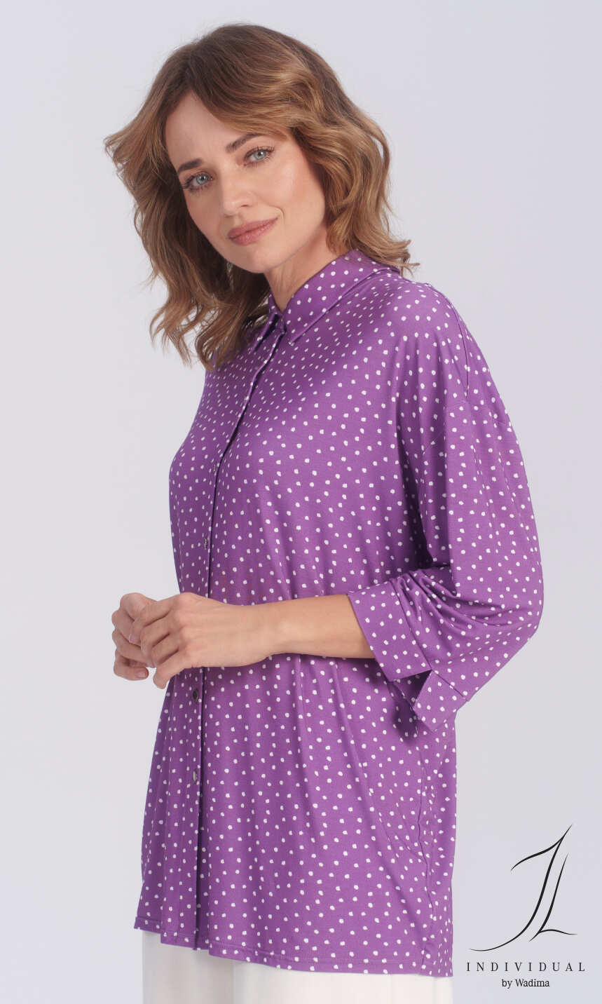 W formie obszernej koszuli, w przepięknym kolorze hiacyntowego fioletu z gęstym, białym nadrukiem w rozmazane groszki. Wykonana z połączenia miękkiej, delikatnej wiskozy z niewielką ilością nadającego dzininie spręzystośći elastanu.