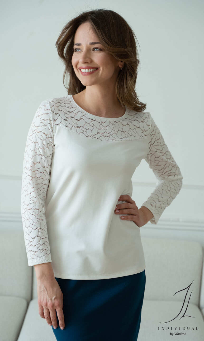 Elegancka, bardzo kobieca, z koronkową wstawką przy dekolcie i koronkowymi rękawami. Wykonana z porządnej, mięsistej dzianiny powstałej w wyniku połączenia naturalnej wiskozy, niewielkiej ilości poliamidu i nadającego dzianinie sprężystości elastanu. Miękka, miła dla ciała.