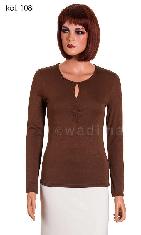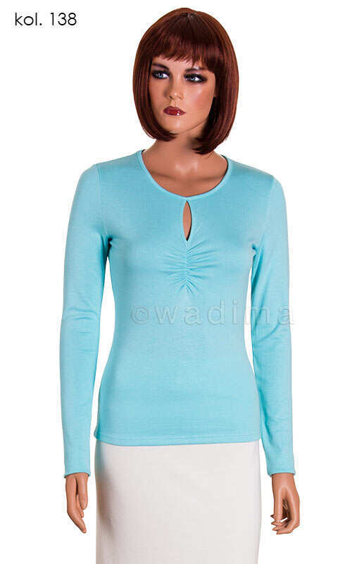 Dekolt półokrągły, zakończony cienką lamówką w tym samym kolorze. Poniżej zalotna łezka, a pod nią na wysokości biustu, pionowo umarszczony materiał, dzięki czemu prosta w swej formie bluzka wygląda skromnie ale bardzo kobieco. Rewelacyjna na co dzień zarówno do spódnicy jak i zwykłych dżinsowych spodni. Praktyczna i wygodna w użytkowaniu.