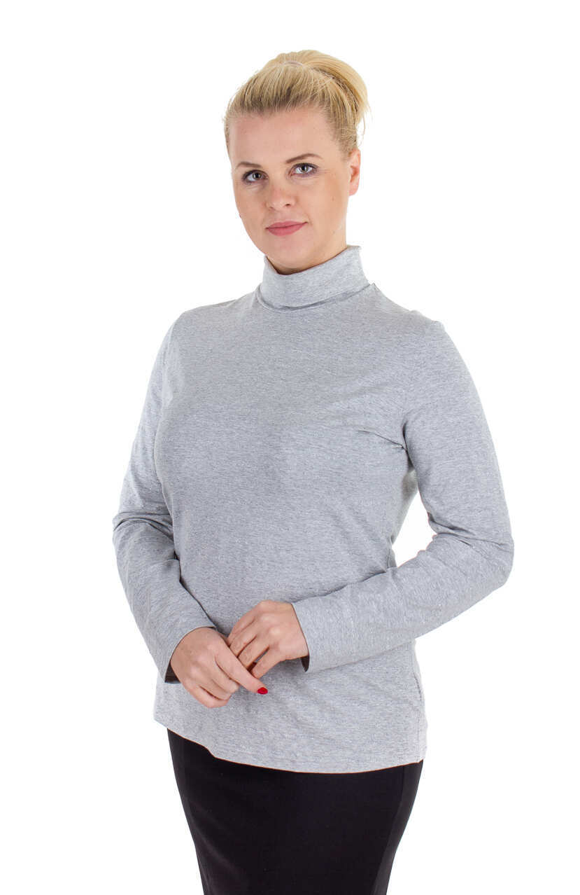Bluzka damska-golf z długim rękawem, dzianina miękka dopasowująca się do sylwetki w cienkie srebrne paski. Prosto i wygodnie to pomysł modelu tej bluzki.