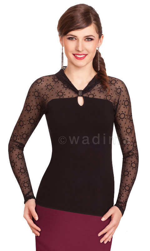 Dekolt nieduży, oryginalny, z dekoracyjną, ściągającą materiał szlufką wysadzaną błyszczącymi, drobniutkimi dżetami. Po środku mała, wdzięczna łezka. Świetnie wygląda w połączeniu z elegancką spódnicą, ale i z eleganckimi spodniami wygląda równie dobrze.
