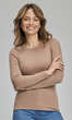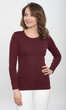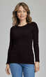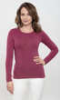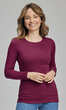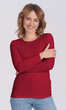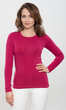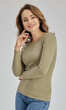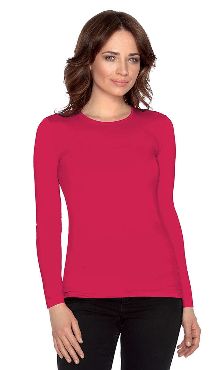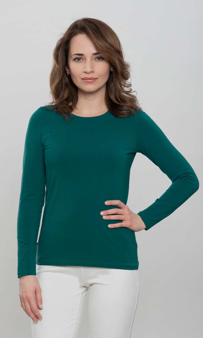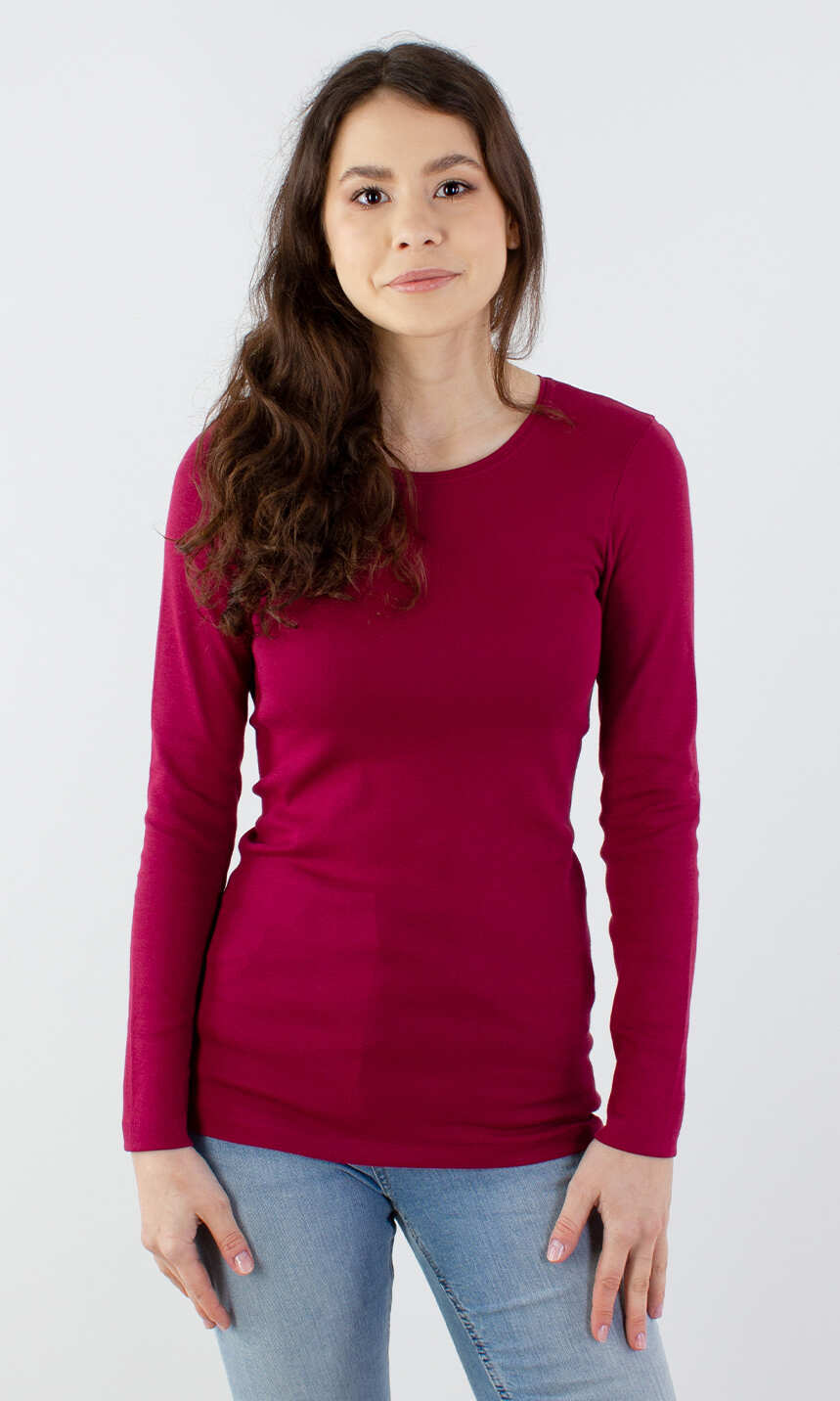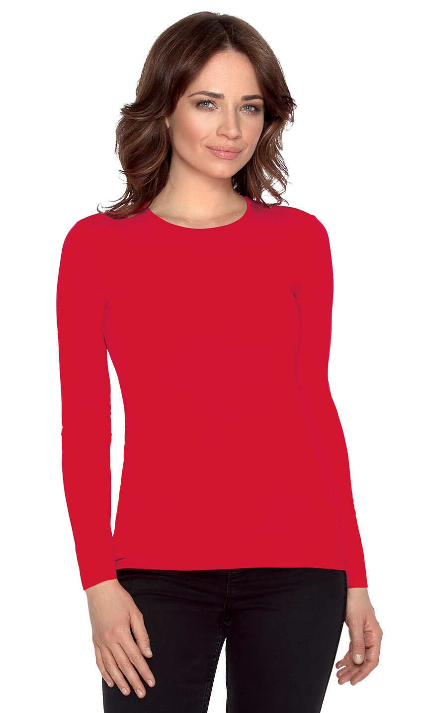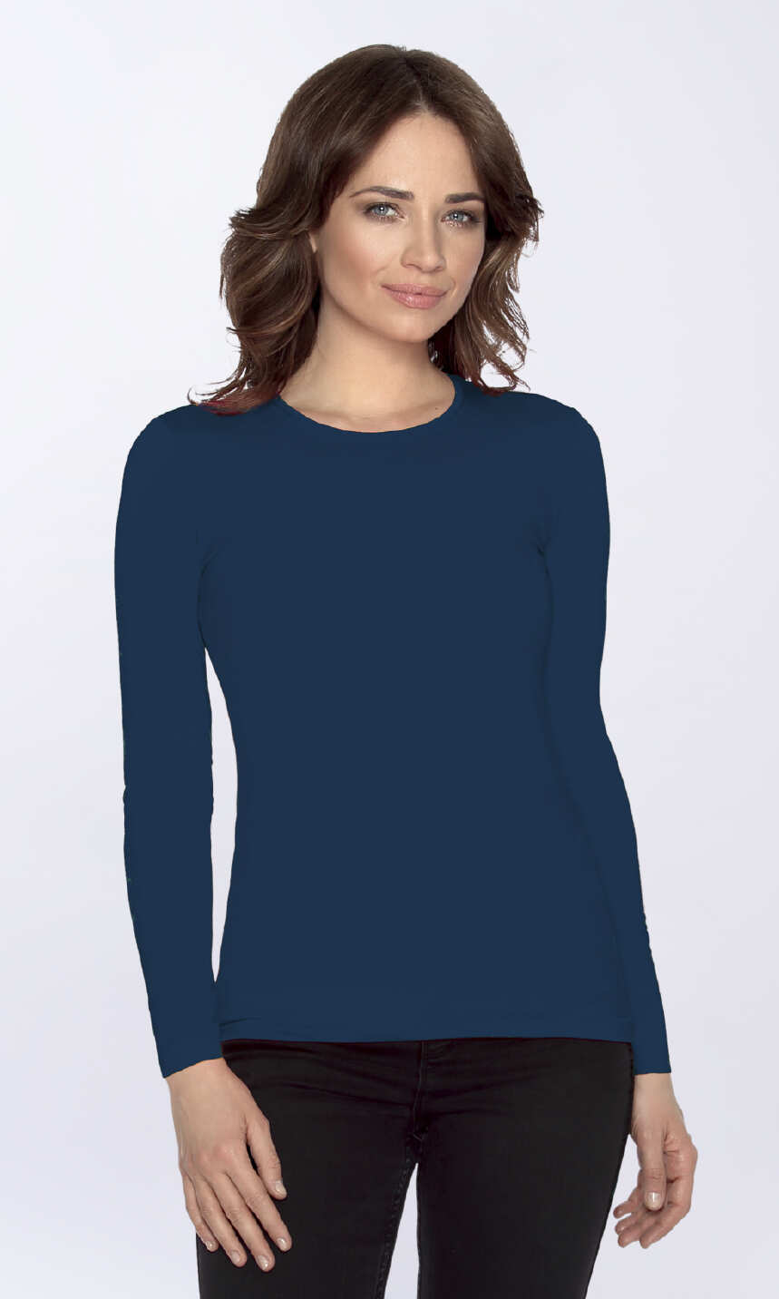 Niewielki, półokrągły dekolt wykończony wąską, ściągaczową wypustką w tym samym kolorze. Rękawy i dół bluzki bardzo ładnie zakończone ściegiem krytym, bez nadto widocznego z wierzchu przeszycia. Brak szwów bocznych. Idealna na co dzień. W chłodniejsze dni doskonale sprawdzi się jako baza pod wszelkiego rodzaju swetry czy wdzianka, w dni mroźne posłuży jako miły dla ciała podkoszulek damski.
