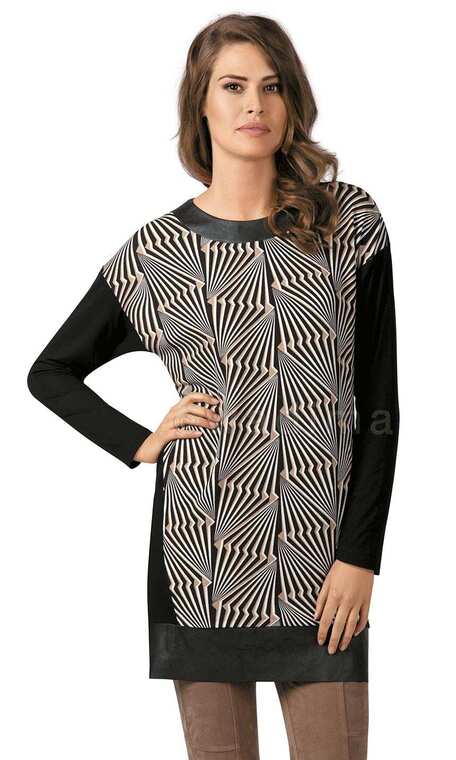 Dekolt wykończony czarną, skórkową plisą. Przód ze zwężającą się ku dołowi, by optycznie zwęzić biodra wstawką z wzorem. Rękawy czarne, tak jak tył bluzki. Dół wykończony czarnym grubym, skórkowym pasem, ładnie harmonizującym z dekoltem. Miła dla ciała. Idealna do wąskich spodni czy leginsów.