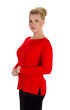 Półokrągły dekolt wykończony cienką wypustką w tym samym kolorze. Rękaw długi, tak jak i dół wykończony podwinięciem. Po bokach niewielkie rozcięcia. Bluzka prosta, bez żadnych dekoracji, idealna zarówno do spodni jak i spódnicy.