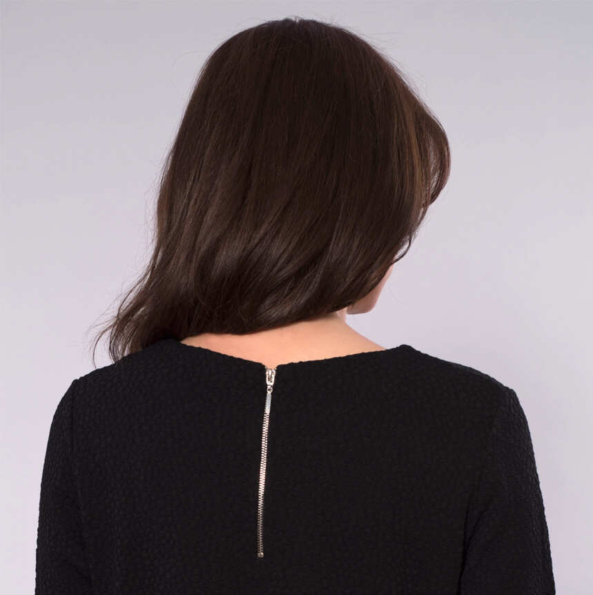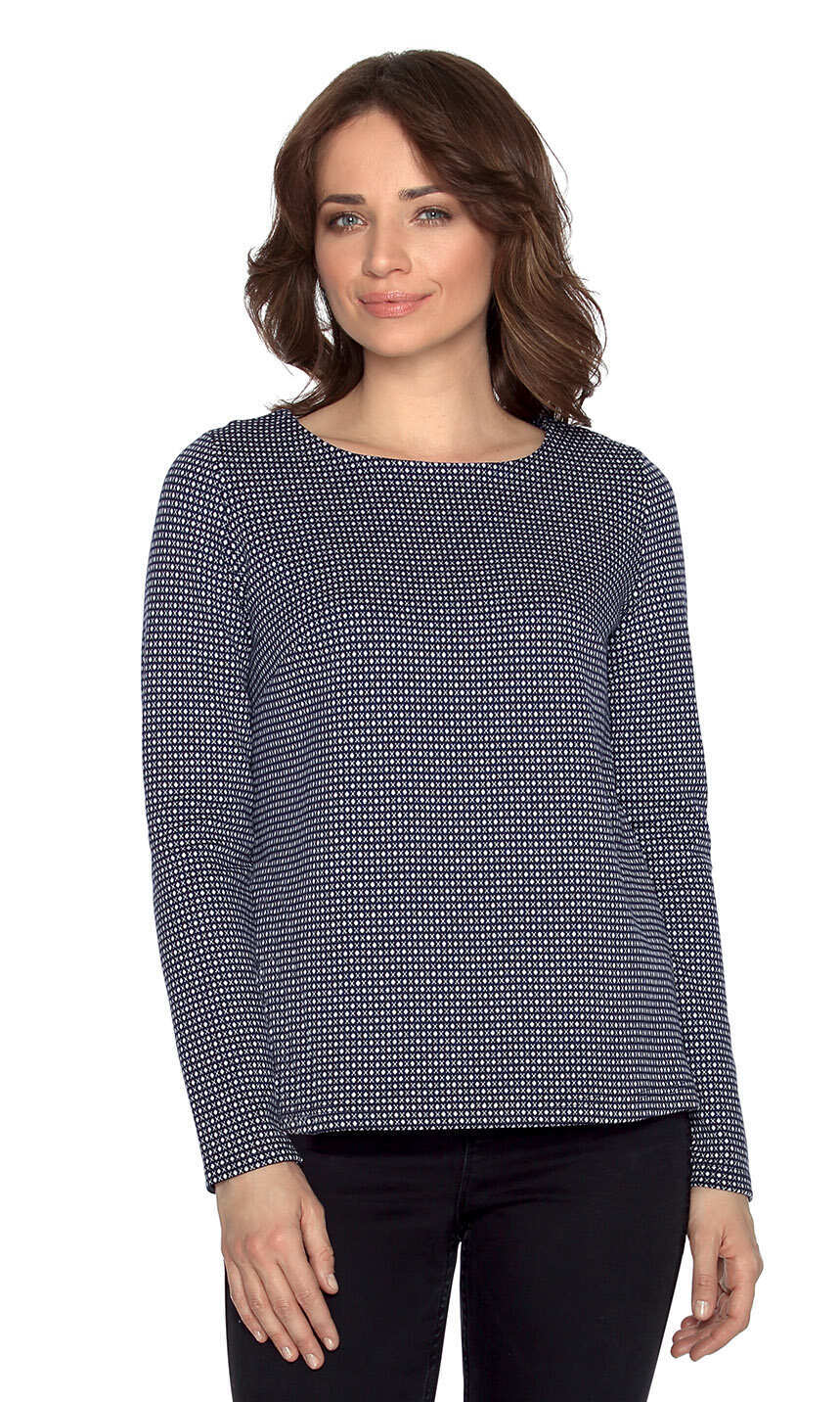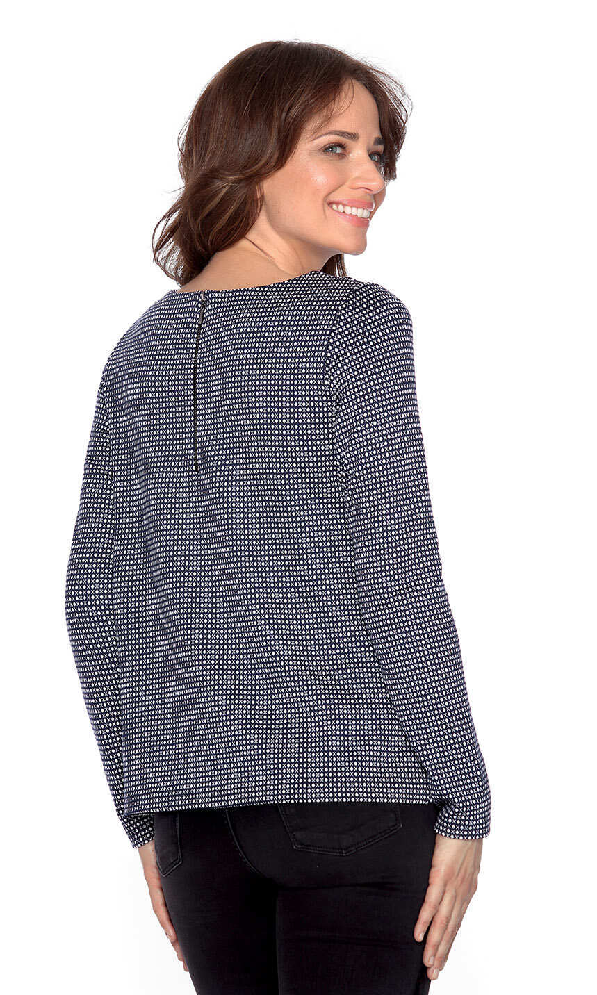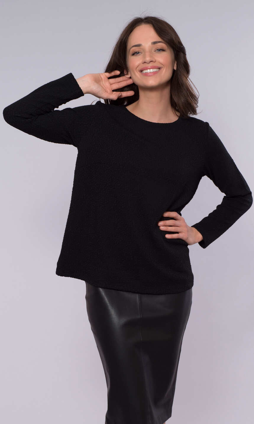Półokrągły dekolt z szeroką plisą od wewnątrz. Z tyłu, pośrodku, srebrny suwak. Rękaw klasyczny. Po bokach niewielkie zaszewki. Dół, tak jak i rękawy zakończone podwinięciem. Idealna zarówno do spódnicy jak i spodni.