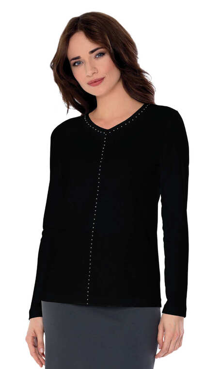Z metalowymi, ozdobnymi blaszkami wokół dekoltu i wzdłuż przodu. Dobra gatunkowo. Wykonana z mięsistej dzianiny powstałej z połączenia wiskozy, niewielkiej ilości poliamidu i nadającego dzianinie sprężystości elastanu.