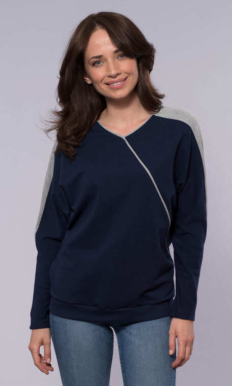 W sportowym stylu; z kontrastowymi, w kolorze szarego melanżu z wplotem srebrnej nitki wstawkami na ramionach. Wykonana z połączenia drapanej wiskozy ( z przyjemnym meszkiem od wewnątrz) i nadającego dzianinie sprężystości elastanu. Mięciutka, bardzo miła dla ciała.