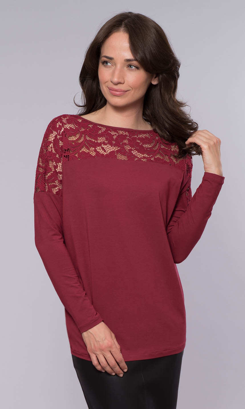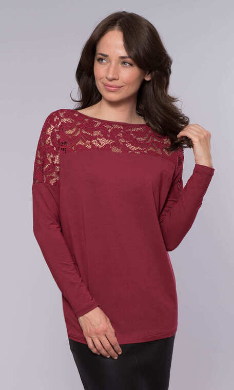 W jesiennym kolorze winnego bordo. Kobieca, z koronkową wstawką przy dekolcie i na ramionach. Wykonana z połączenia delikatnej wiskozy i nadającego dzianinie spręzystości elastanu. Miekka, miła dla ciała.