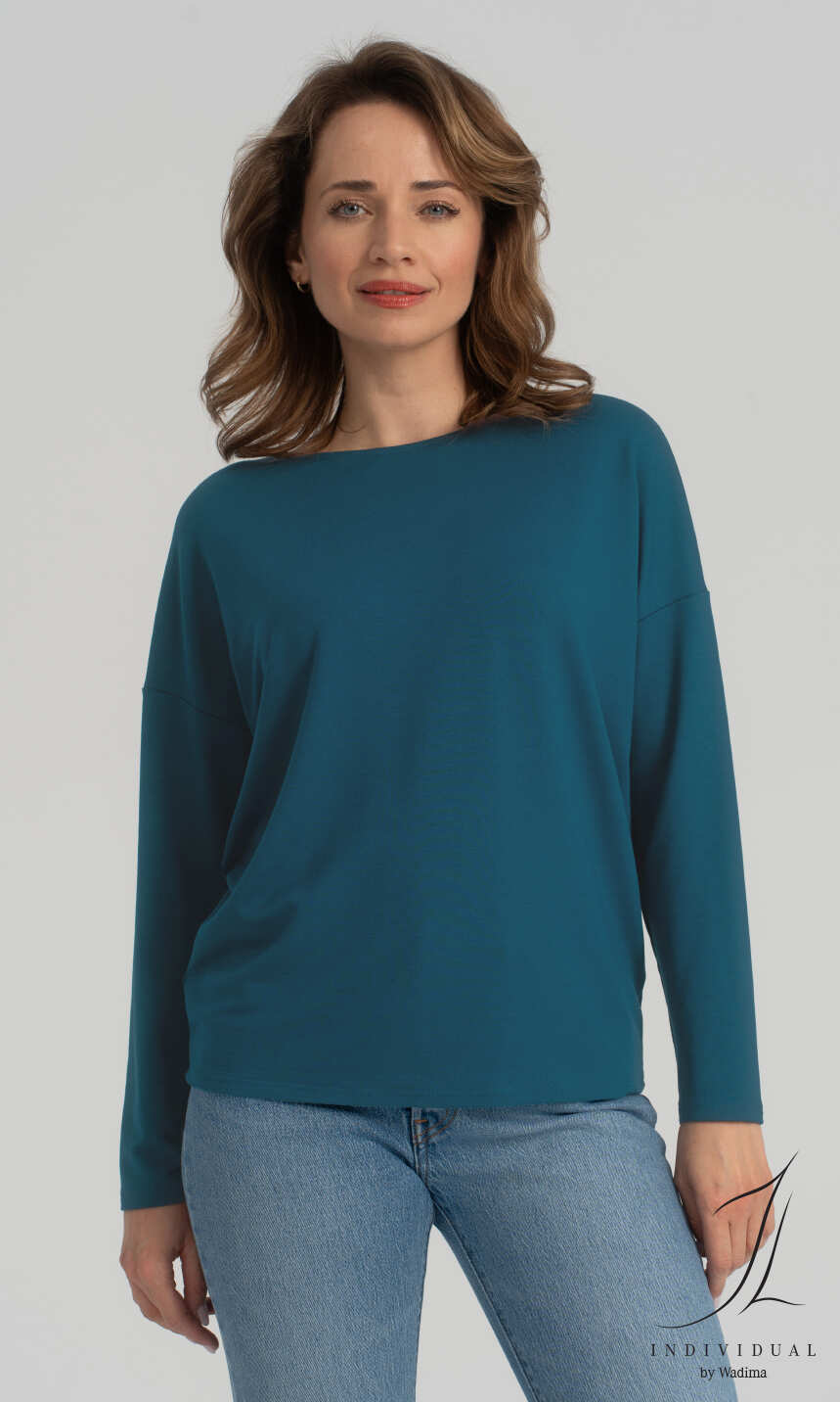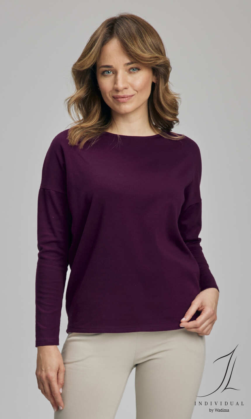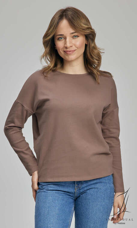 Forma luźna, lekko zwężana ku dołowi. Całość w jednolitym kolorze, bez ozdób. Półokrągły dekolt wykończony wywiniętą pod spód lamówką. Rękaw z tzw. opuszczonym ramieniem. Dół zakończony podwinięciem. Praktyczna i wygodna w użytkowaniu. Do wykorzystania w wielu stylizacjach.
