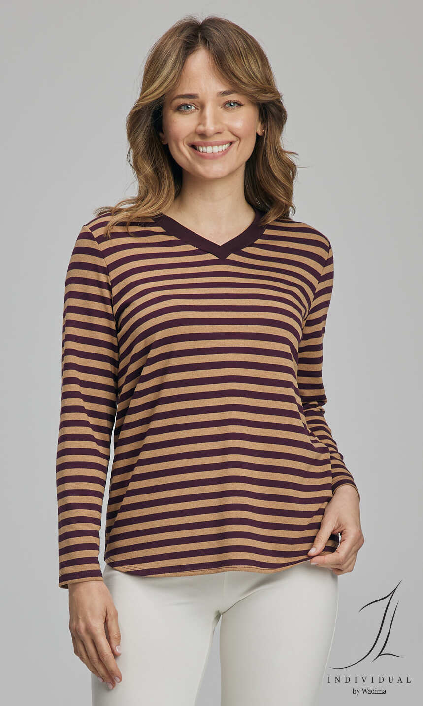 W przyjemnym dla oka kolorystycznym zestawieniu bakłażanu z beżem wielbłądzim w paski. Wykonana z połączenia delikatnej wiskozy z niewielkim dodatkiem nadającego dzianinie sprężystości elastanu.
