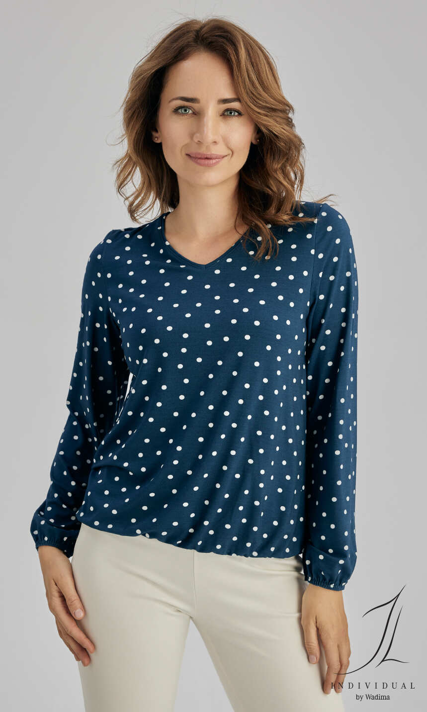 W zawsze modnym kolorze granatu, z nadrukiem w białe groszki. Wykonana z połączenia delikatnej wiskozy z nadającym dzianinie sprężystości elastanem. Miękka, przyjemna dla ciała.