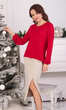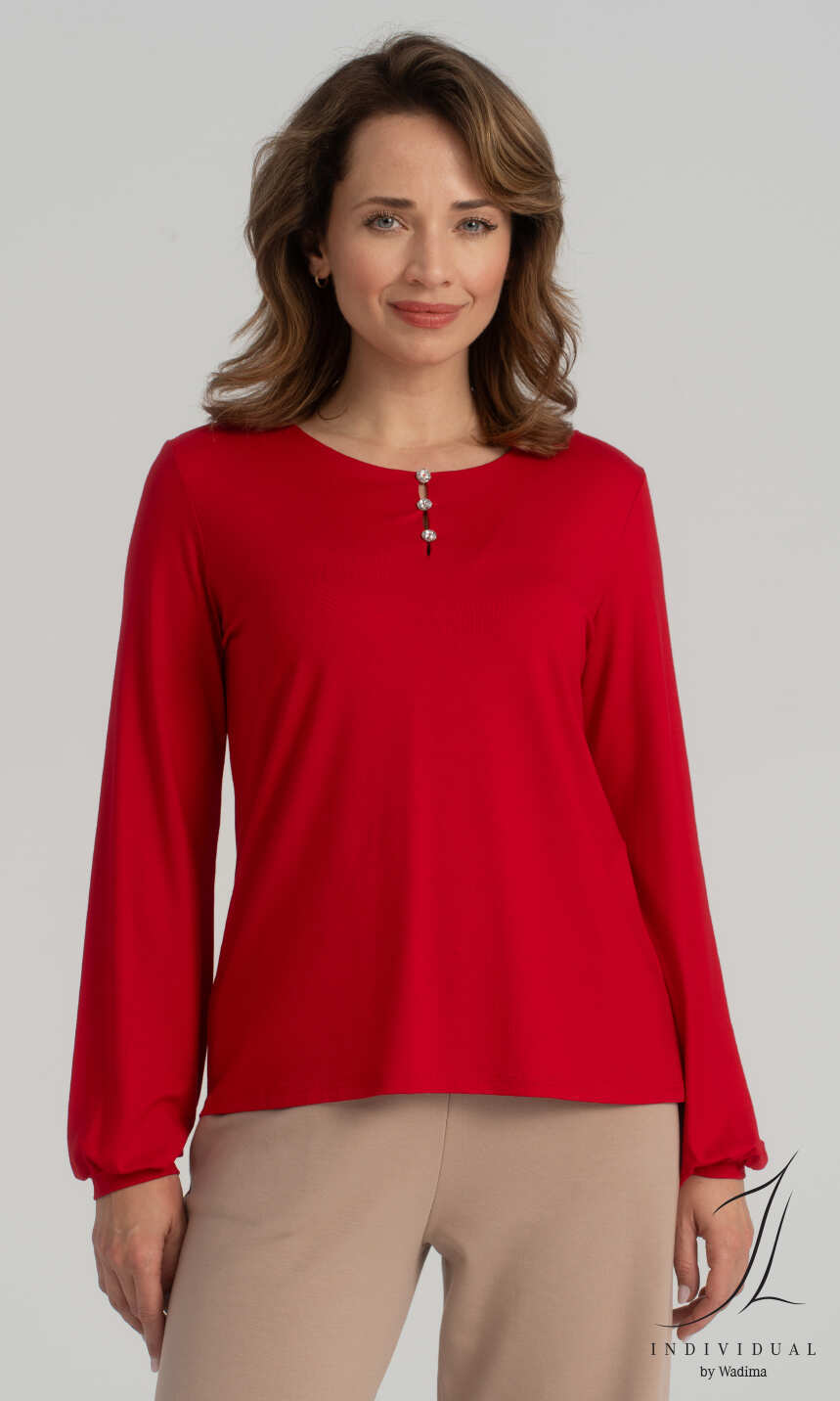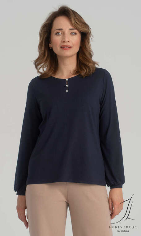 Fason minimalnie rozszerzany ku dołowi. Półokrągły dekolt starannie wykończony szeroką plisą od wewnątrz. Pośrodku rozcięcie, "złapane" trzema guziczkami kryształkami. Rękaw wszyty klasycznie, zakończony marszczeniem i półtoracentymetrowym mankiecikiem z tego samego materiału. Idealna zarówno do spodni jak i spódnicy.