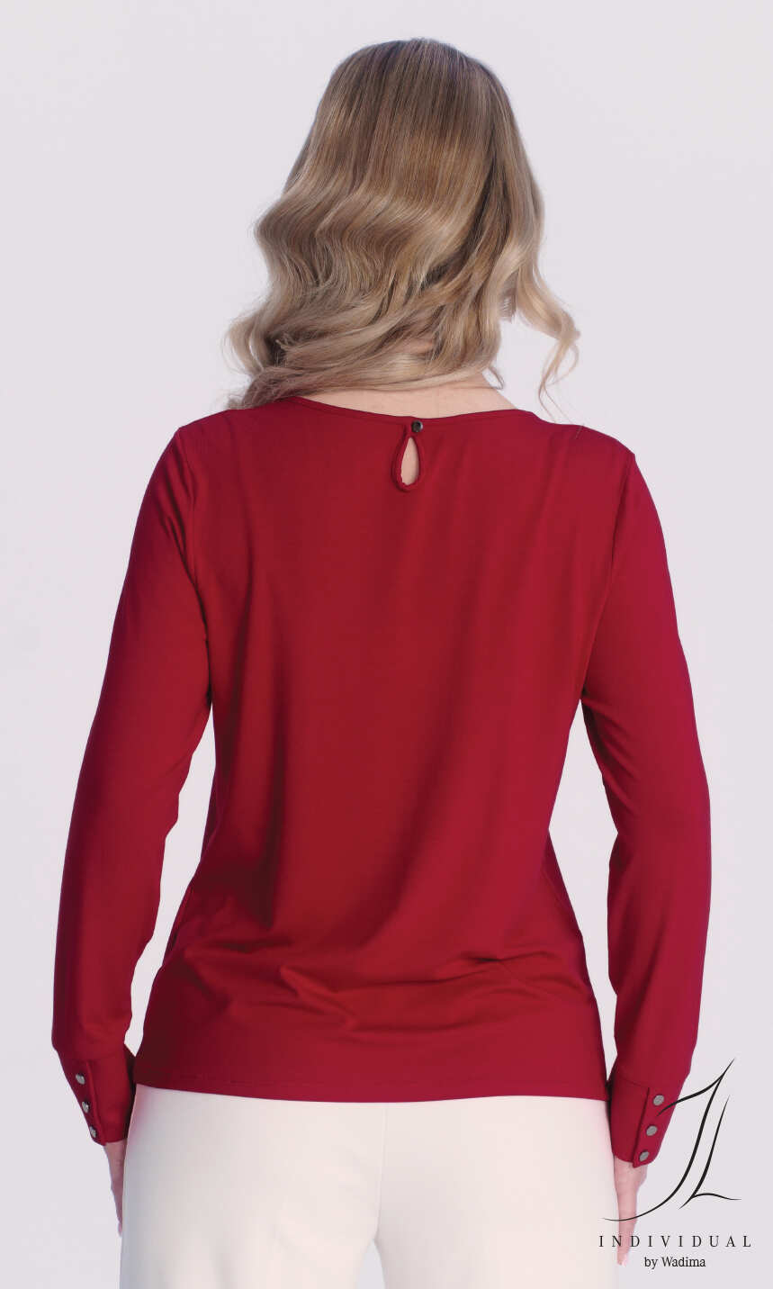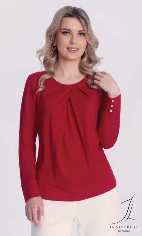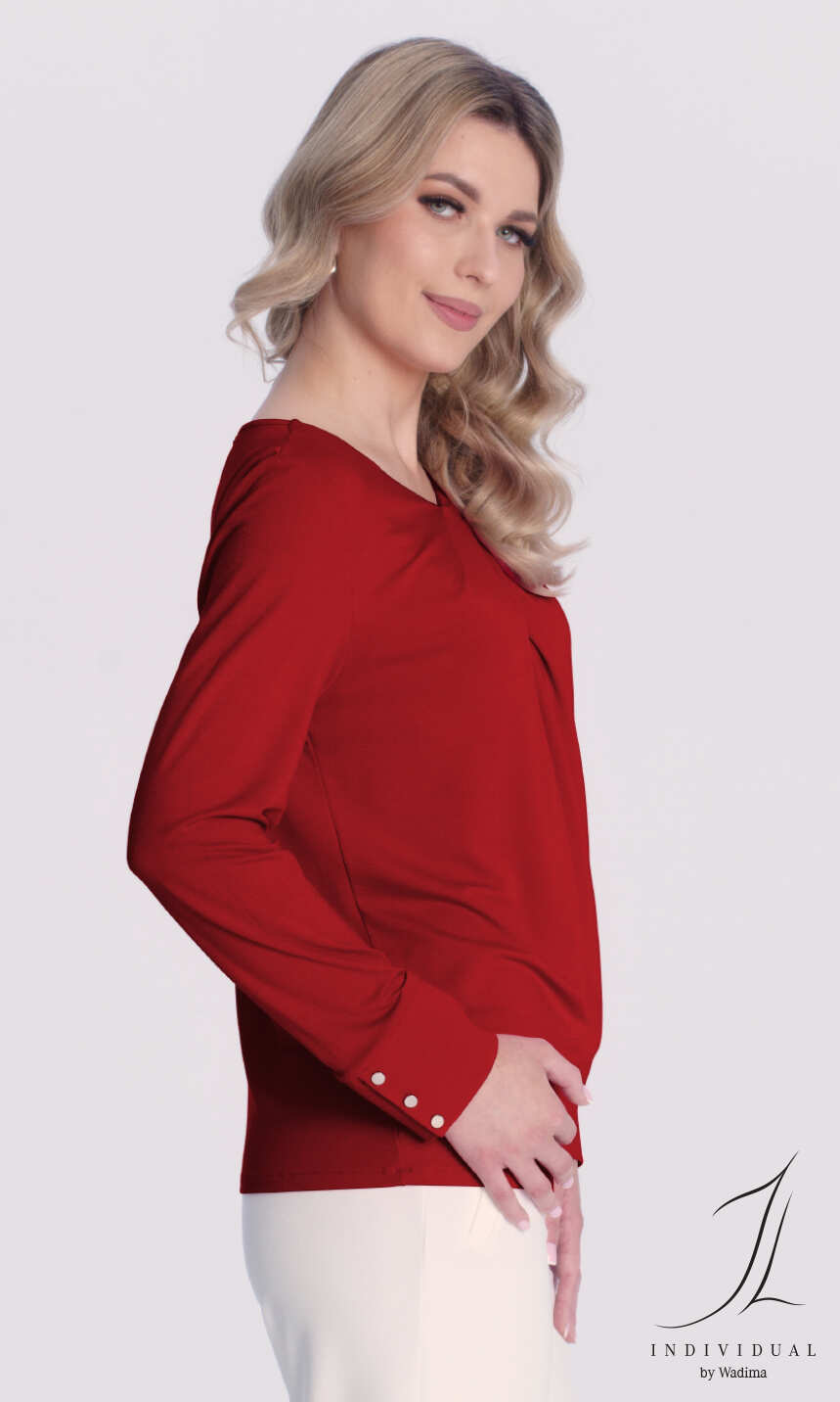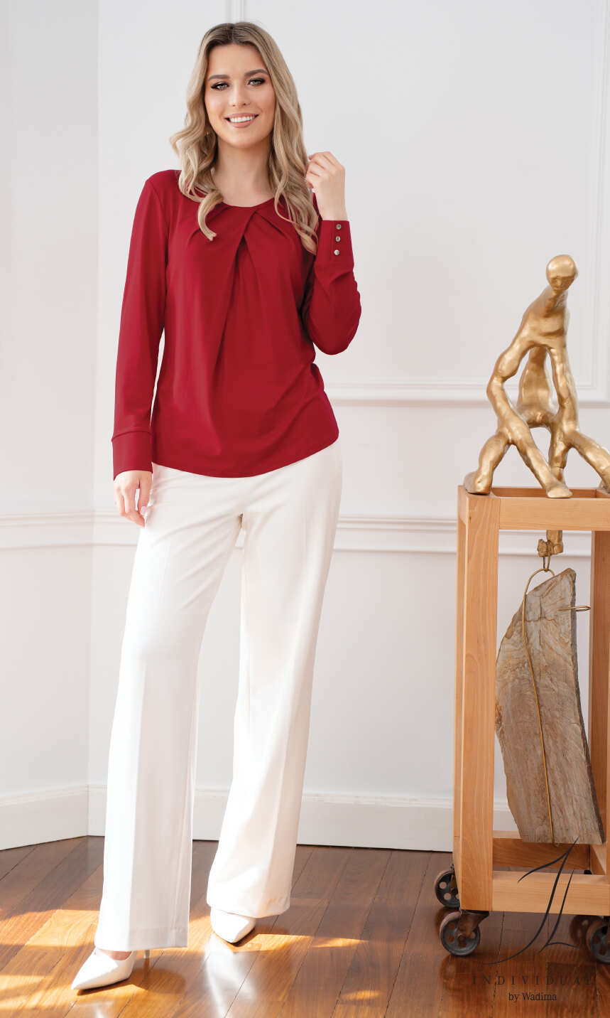 Półokrągły dekolt z szeroką plisą od wewnątrz w przedniej jego części, z tyłu delikatna, zapinana na mały guziczek łezka. Przy dekolcie szerokie, ładnie rozkładające się ku dolowi zakładki. Rękaw wszyty klasycznie, z podkrojem, bardzo ładnie wykończony szerokim mankietem z trzema guziczkami. Ładnie prezentuje się zarówno do elegackich spodni czy eleganckiej spódnicy. Idealna dla Pań ceniących oryginalność i najwyższą jakość.