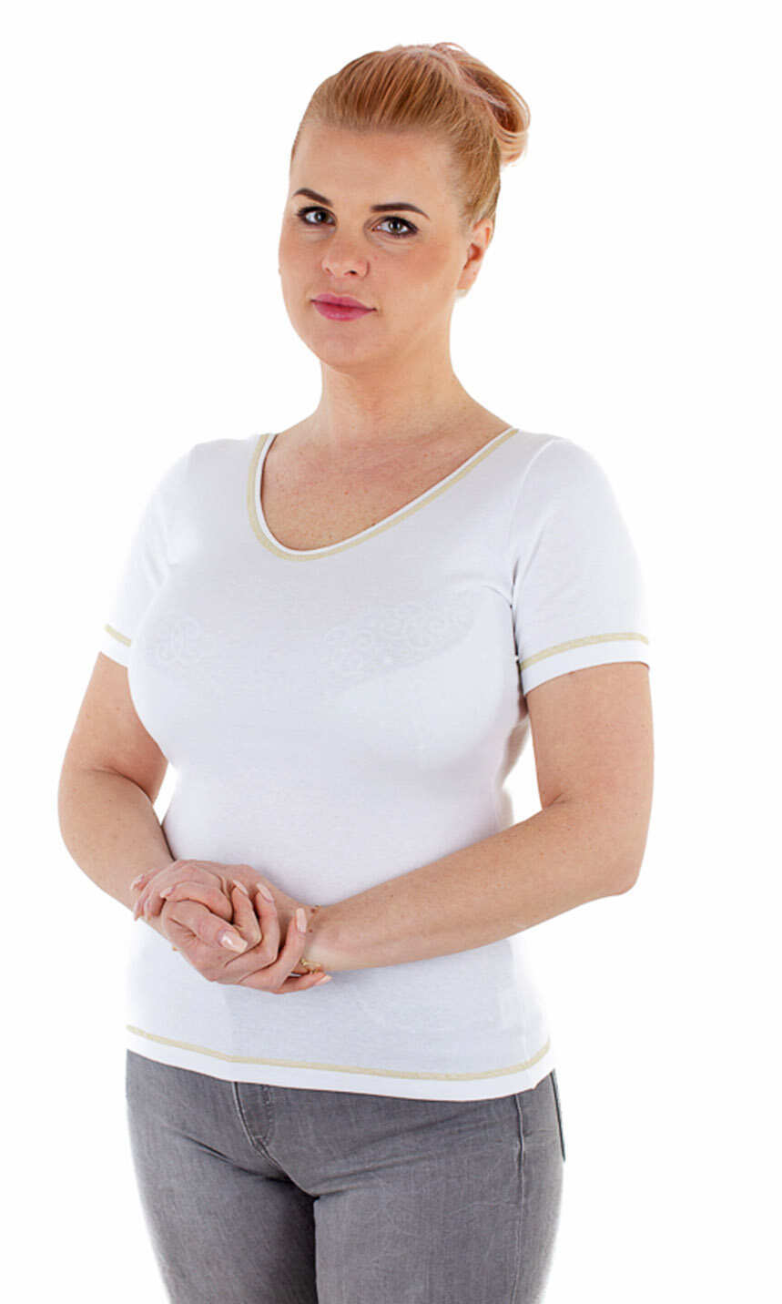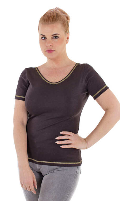 Jedyną jej ozdobą jest dekoracyjne przeszycie nicią w kontrastowym kolorze przy dekolcie w serek, rękawkach i u dołu bluzki. Z tyłu również linia w serek, tylko mniej wykrojona. Prosta, bardzo praktyczna, rewelacyjna do zwykłych, dżinsowych spodni czy spódnicy.