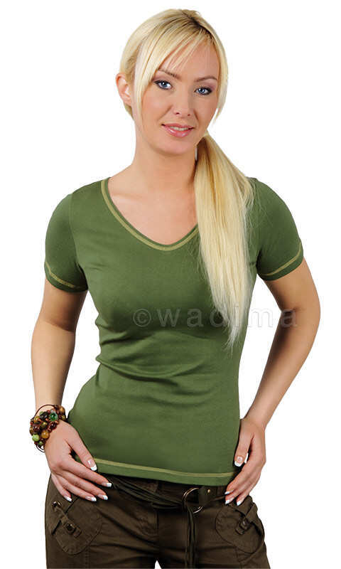 Jedyną jej ozdobą jest dekoracyjne przeszycie nicią w kontrastowym kolorze przy dekolcie w serek, rękawkach i u dołu bluzki. Z tyłu również linia w serek, tylko mniej wykrojona. Prosta, bardzo praktyczna, rewelacyjna do zwykłych, dżinsowych spodni czy spódnicy.
