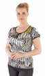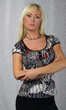 Okrągły dekolt wykończony wąską lamówką, tak jak końce rękawków. Po środku, na czarnej taśmie, obciągnięte tym samym materiałem trzy guziczki. Poniżej efektowne, półokrągłe odcięcie satynowej góry od wiskozowej reszty. Dobrze wygląda zarówno ze spodniami, jak i spódnicą.