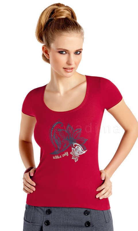 Głęboki dekolt o zaokrąglonej linii wykończony wąską, bawełnianą lamówką. Przód bluzki zdobi efektowny sitodruk z połyskującymi dżetami (dostępne różne wzory sitodruku).