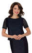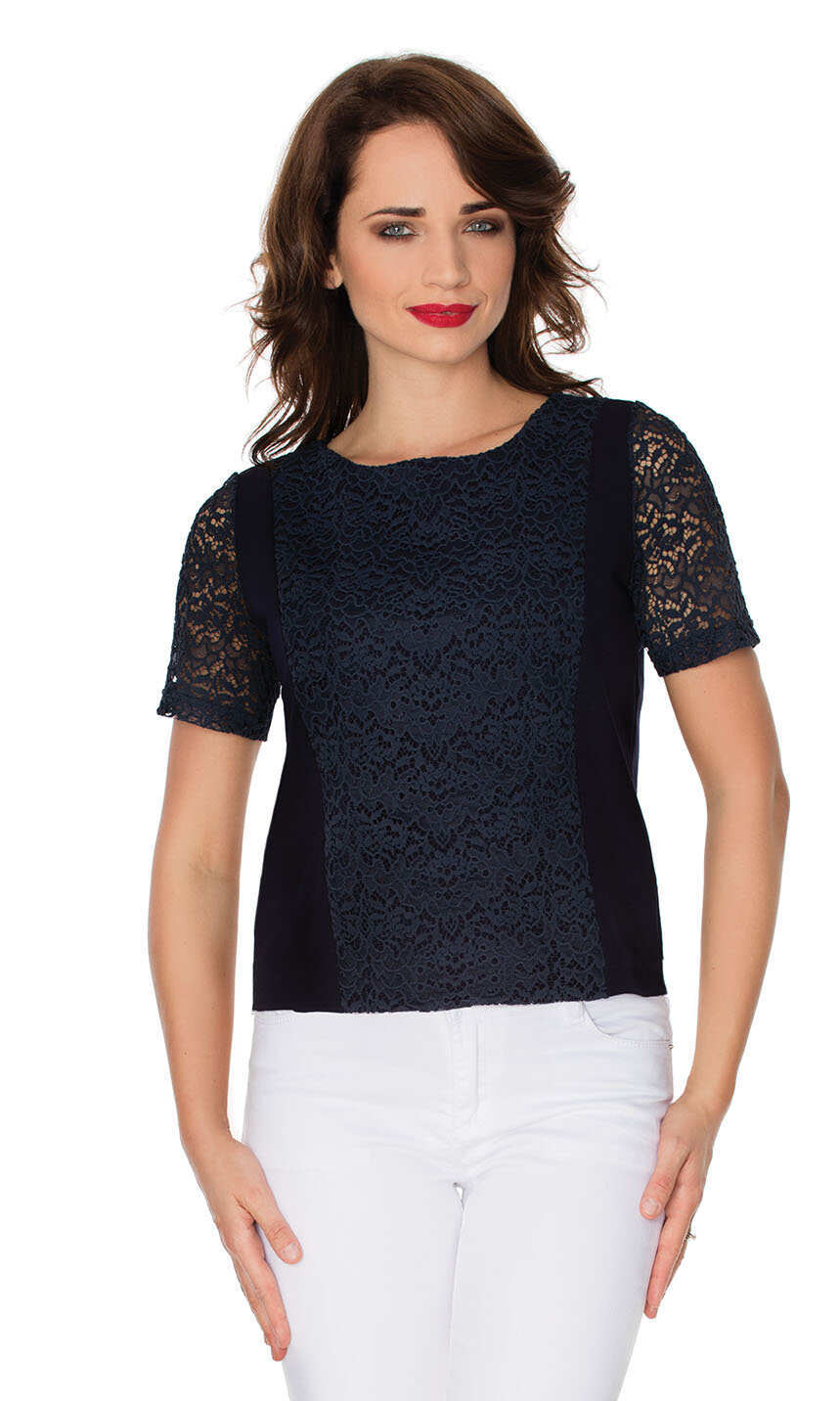 Bardzo dobrej jakości. Wykonana z połączenia grubszej wiskozy z niewielkim dodatkiem poliestru i nadającym dzianinie sprężystości elastanem. Niewielki dekolt ładnie wykończony przewinięta lamówką. Zarówno z przodu jak i z tyłu koronkowa, szeroka wstawka na materiale. Rękawki całe koronkowe, zakończone podwinięciem. Ze spódnicą 10585 tworzą bardzo elegancki kostium damski.
