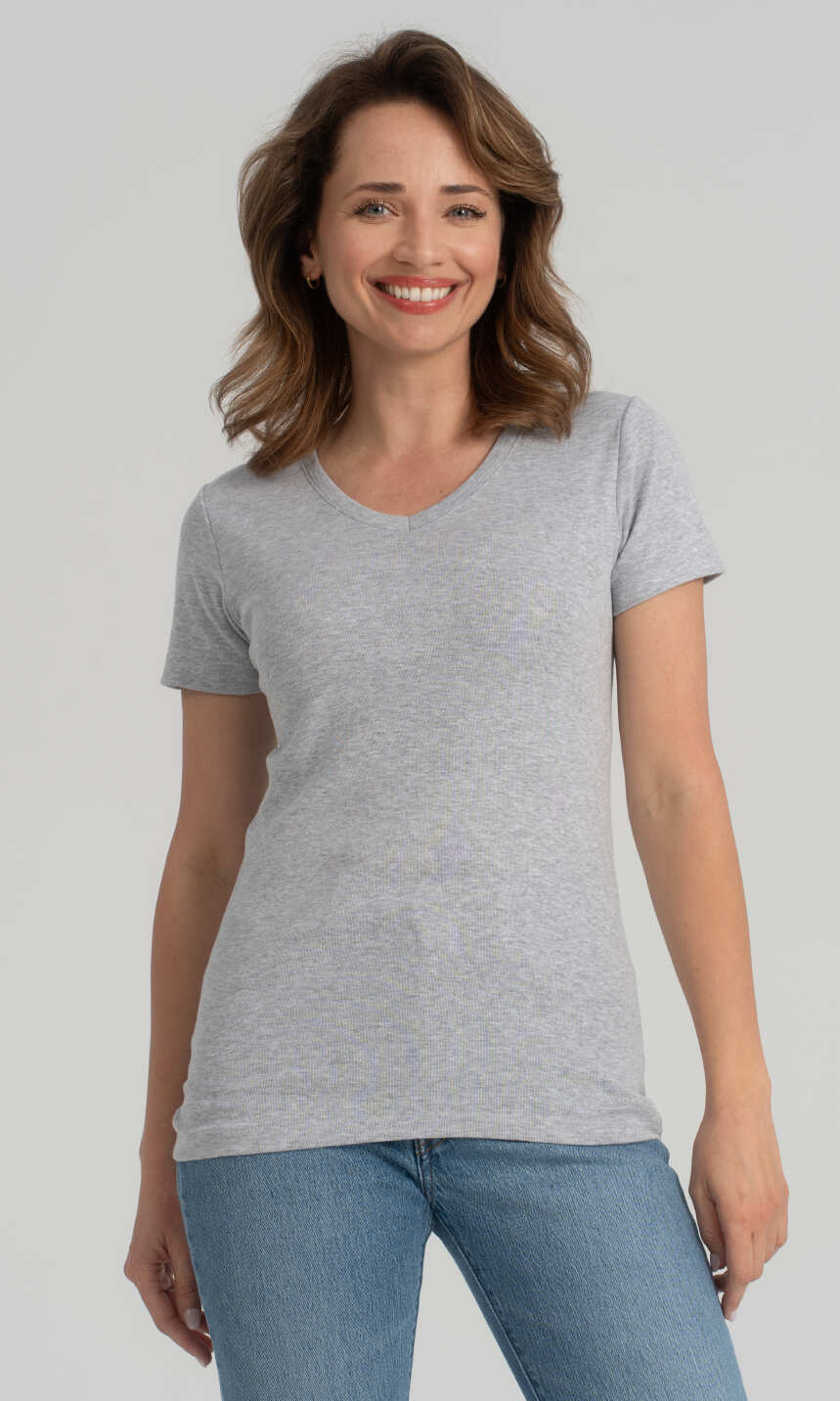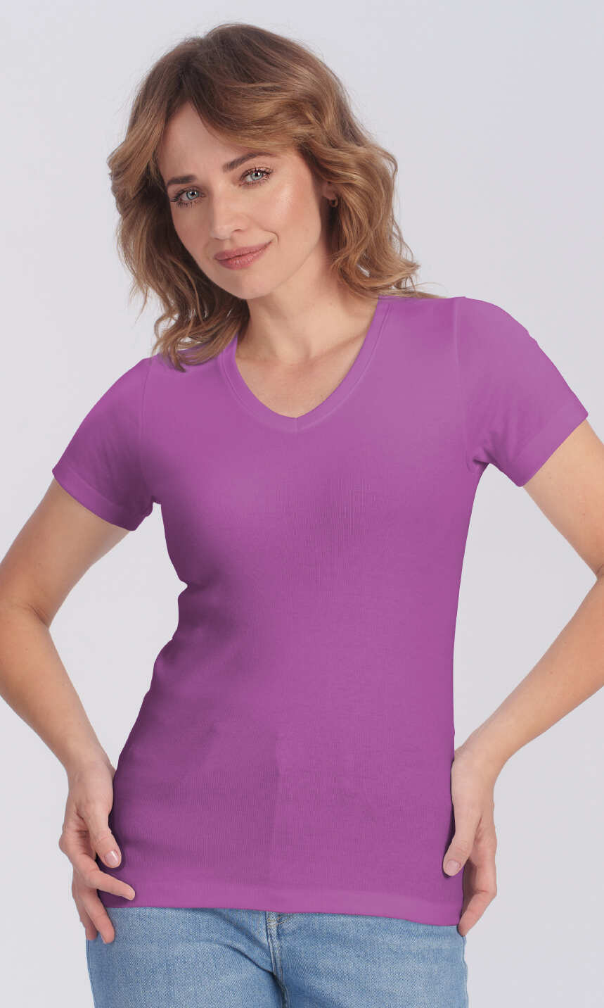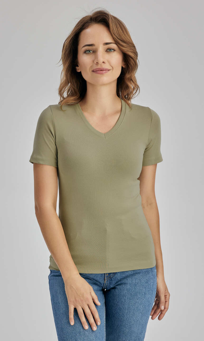 Dekolt w serek wykończony bawełnianą, ściągaczową wypustką w tym samym kolorze. Krótki rękaw zakończony podwinięciem. Brak szwów bocznych oraz splot ściągaczowy dzianiny zapewniają wysoki komfort użytkowania. Doskonała na lato, choć sprawdzi się również jako baza pod bluzę czy sweter, a w chłodniejsze dni jako wygodny i miły dla ciała damski podkoszulek.