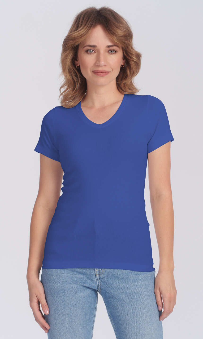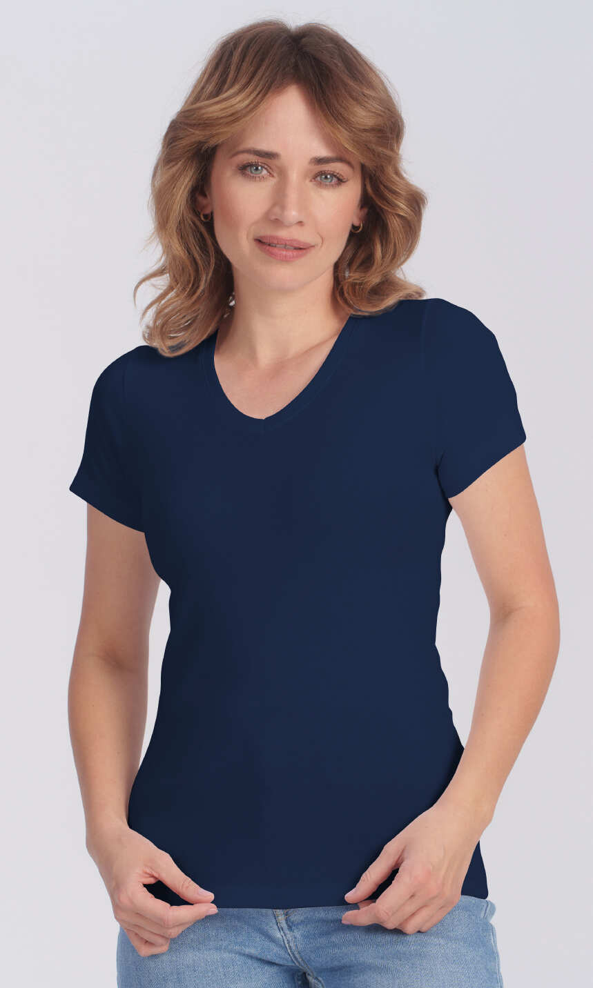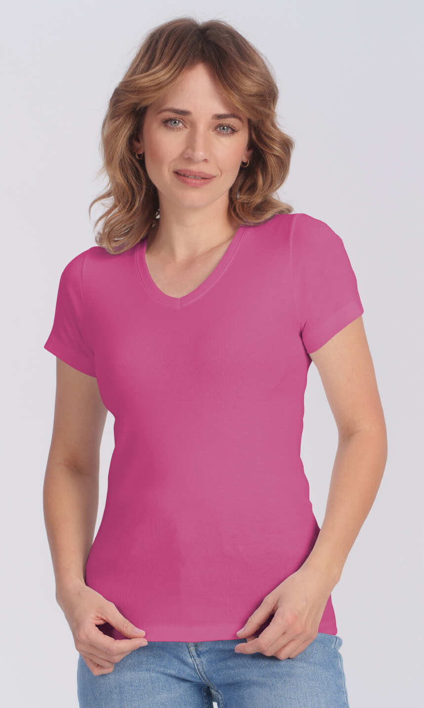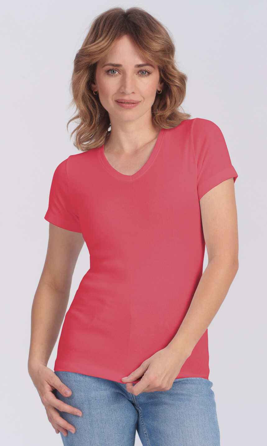 Dekolt w serek wykończony bawełnianą, ściągaczową wypustką w tym samym kolorze. Krótki rękaw zakończony podwinięciem. Brak szwów bocznych oraz splot ściągaczowy dzianiny zapewniają wysoki komfort użytkowania. Doskonała na lato, choć sprawdzi się również jako baza pod bluzę czy sweter, a w chłodniejsze dni jako wygodny i miły dla ciała damski podkoszulek.