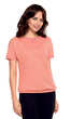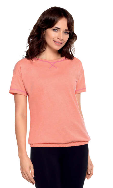 Półokrągły dekolt wykończony podwinięciem i dekoracyjnymi przeszyciami. Krótki rękaw w formie szerokiego, opuszczonego ramienia z obniżonym szwem i doszytym krótkim rękawkiem, ozdobionym dekoracyjnym przeszyciem. Dół z trzycentymetrową gumą wciągniętą w materiał. Idealna do ukrycia niechcianych krągłości. Świetna na co dzień, zarówno do spódnicy jak i sportowych spodni.