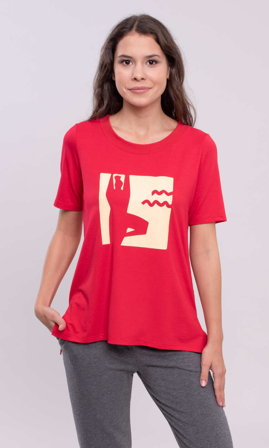 W formie T-shirtu z sitodrukiem Yoga na przodzie. Bardzo dobra gatunkowo. Wykonana z połączenia delikatnej, chłodzącej latem wiskozy z nadającym dzianinie sprężystości elastanem. Mięsista, miękka, miła dla ciała.