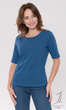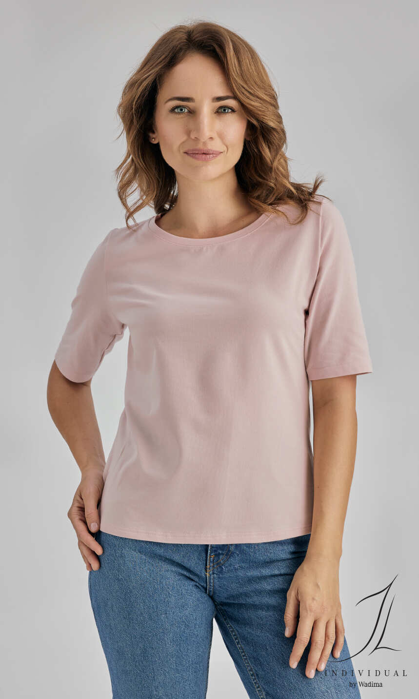 Bluzka damska o uniwersalnym, klasycznym fasonie. Wykonana z połączenia najwyższej jakości bawełny z niewielkim dodatkiem nadającego dzianinie sprężystości elastanu.