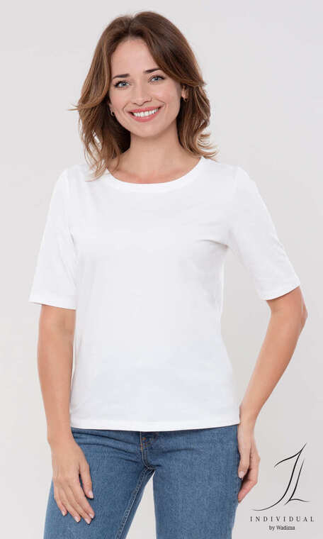 Bluzka damska o uniwersalnym, klasycznym fasonie. Wykonana z połączenia najwyższej jakości bawełny z niewielkim dodatkiem nadającego dzianinie sprężystości elastanu.