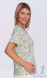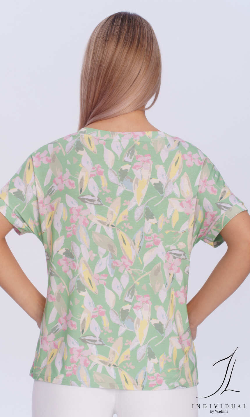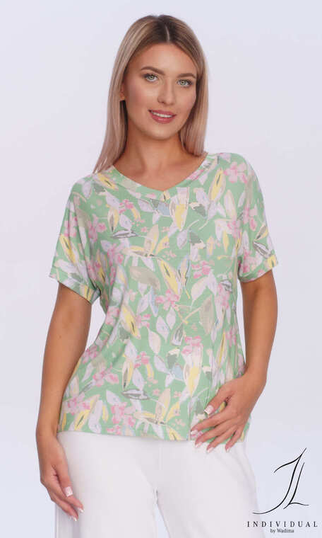 Swobodna, casualowa bluzka z przyjemnej w dotyku dzianiny z ładnie zestwionym kolorystycznie roślinnym motywem, to idealna propozycja na co dzień. Wykonana z wysokiej jakości delikatnej wiskozy z niewielkim dodatkiem nadającego sprężystości elastanu, co zapewnia maximum komfortu podczas upalnego lata.