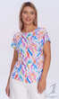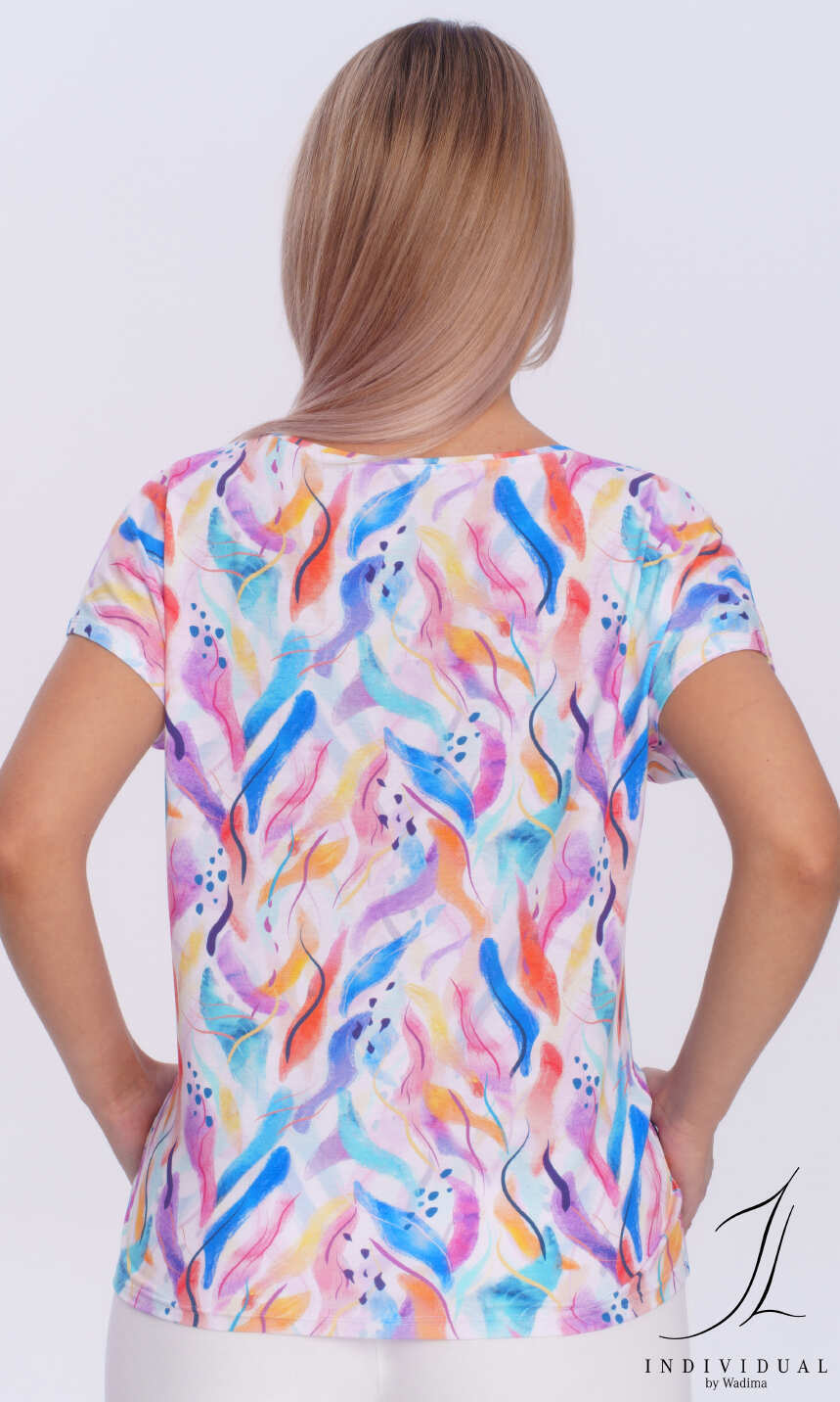 W prostej, luźnej formie, z letnim, wielobarwnym wzorem. Wykonana z cienkiej, delikatnej dzianiny wiskozowej z niewielkim dodatkiem elastanu. Miękka, miła dla ciała.