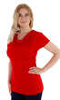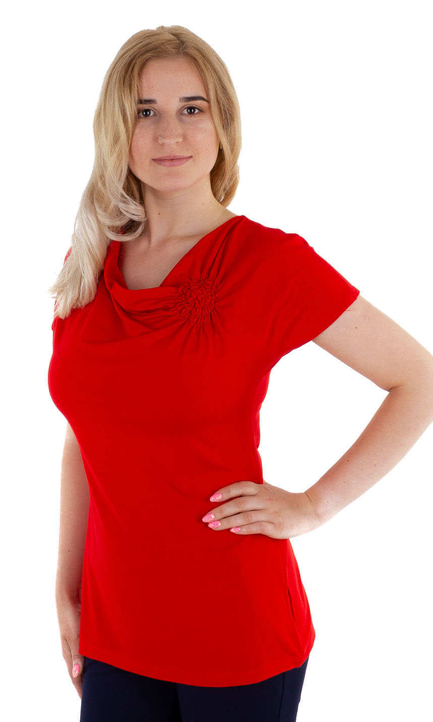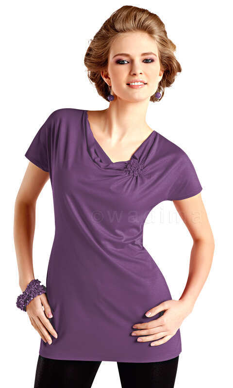 Prosta a zarazem interesująca za względu na oryginalny, luźny dekolt, wzbogacony imitującym kwiat upięciem. Fason dłuższy, uniwersalny, doskonały do spódnicy, spodni czy leginsów.