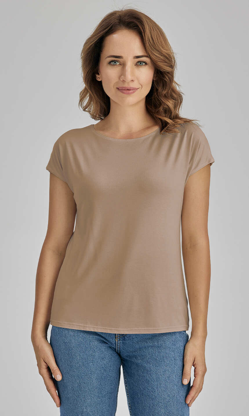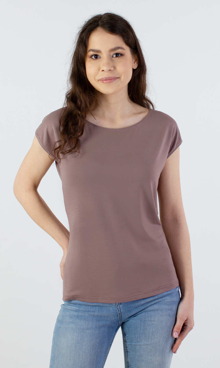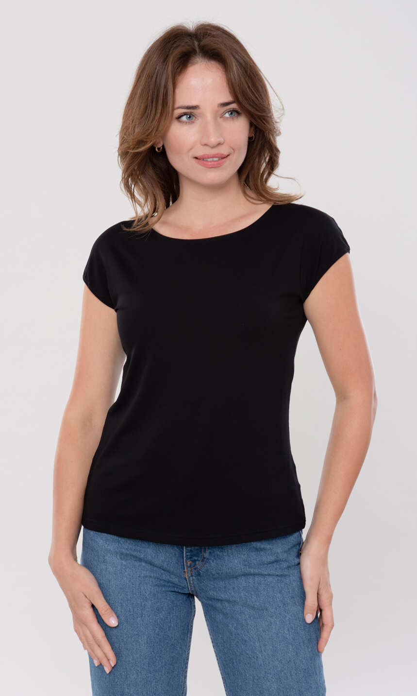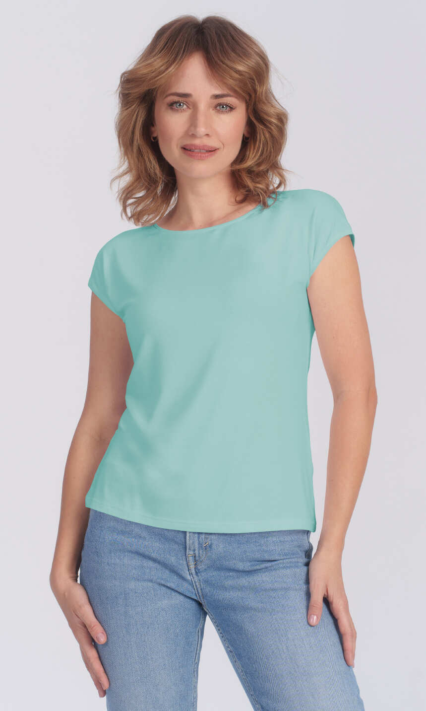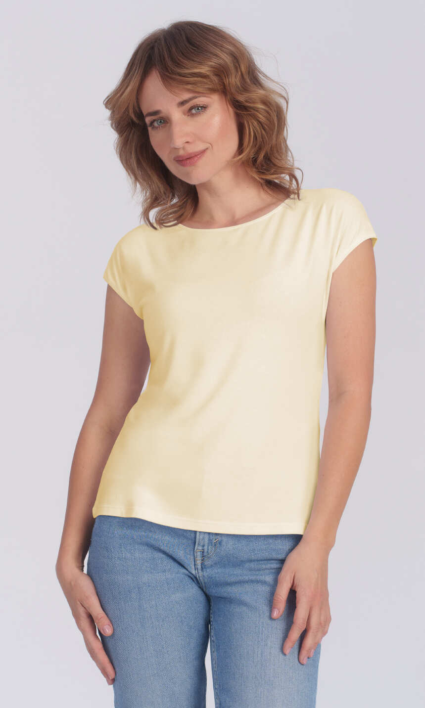 Prosta, elegancka forma i bardzo dobra jakość to atuty tego modelu. Wykonana z połączenia delikatnej, chłodzącej latem wiskozy i niewielkiej ilości nadającego dzianinie sprężystości elastanu.