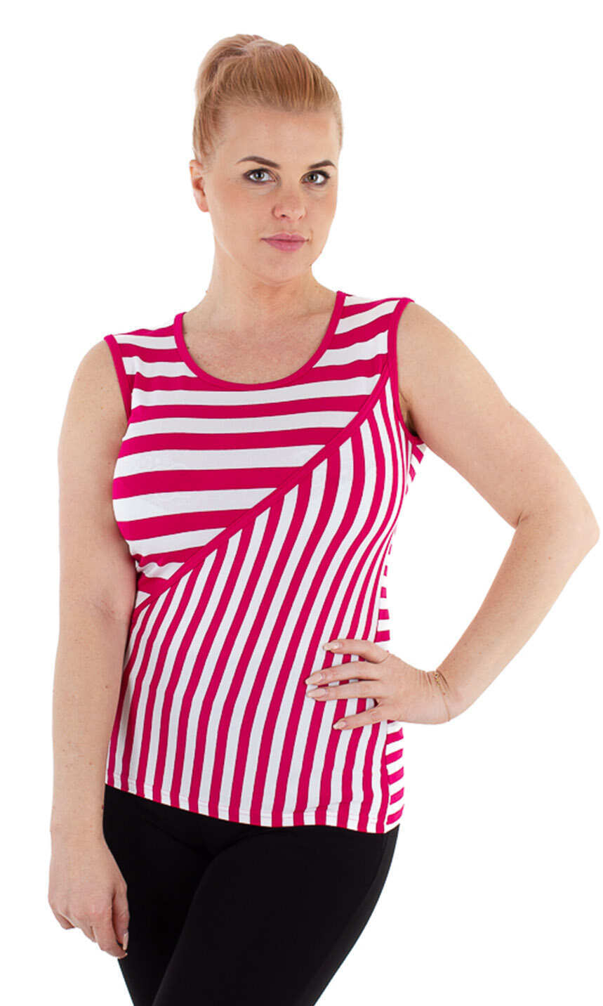 Półokrągły dekolt wykończony tak jak i szerokie ramię cienką lamówką, którą ukosem naszyto również na przodzie bluzki. Rozgranicza ona pionowe i poziome paski. Tył tylko w paski poziome. Dół zakończony podwinięciem. Idealna do białej, czarnej bądź amarantowej spódniczki, chociaż ze spodniami wygląda równie dobrze.