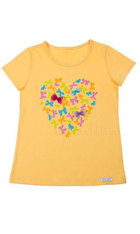 Dekolt wykończony cienką lamówką w tym samym kolorze. Rękawki i dół podwinięte. W zależności od koloru, różne nadruki na przodzie.T-shirty w kolorze ciemnego różu z wdzięczną mini garderobą, a żółte ananasowe z nadrukiem w kształcie dużego serca, utworzonego z małych, kolorowych kokardek, z przyszytymi trzema dekoracyjnymi kokardkami z tiulu. Boki lekko rozszerzane ku dołowi. Urocza, przewiewna i wygodna. Rewelacyjna na lato i nie tylko.