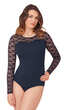 Półokrągły dekolt wykończony wąską lamówką. Przód i rękawy z koronkową, sprężystą wstawką w kwiatuszki, w tym samym kolorze. Długie rękawy zakończone podwinięciem. Dół zapinany na dwa zatrzaski. Delikatne i przyjemne dla ciała. Razem z figami 100144, 100145, podkoszulkiem 10272, tworzą bardzo ładny komplet damskiej bielizny.