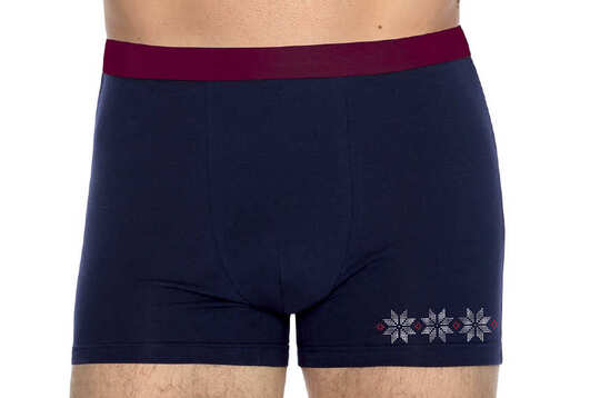 Miłe dla ciała. Wykonane z połączenia najwyższej jakości bawełny ze sprężystym elastanem. Całe w kolorze granatu z delikatnym zimowym nadrukiem na lewej nogawce ( trzy jasne śnieżynki). W pasie szeroka gumka obciągnięta bordową, bawełnianą dzianiną. Z przodu, wzmocniona podwójnym materiałem wygodna kieszonka o anatomicznym kroju. Nogawki zakończone podwinięciem. Miękkie, wygodne i trwałe.