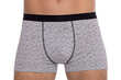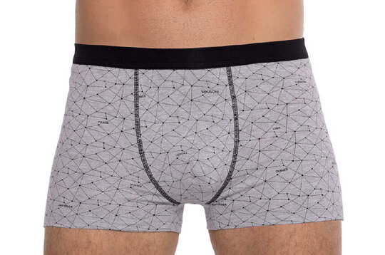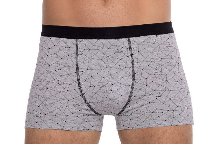 Bokserki szare z delikatnym nadrukiem i dekoracyjnym przeszyciem. W pasie wszyta szeroka guma. Nogawki wykończone podwinięciem. Wygodne i trwałe.