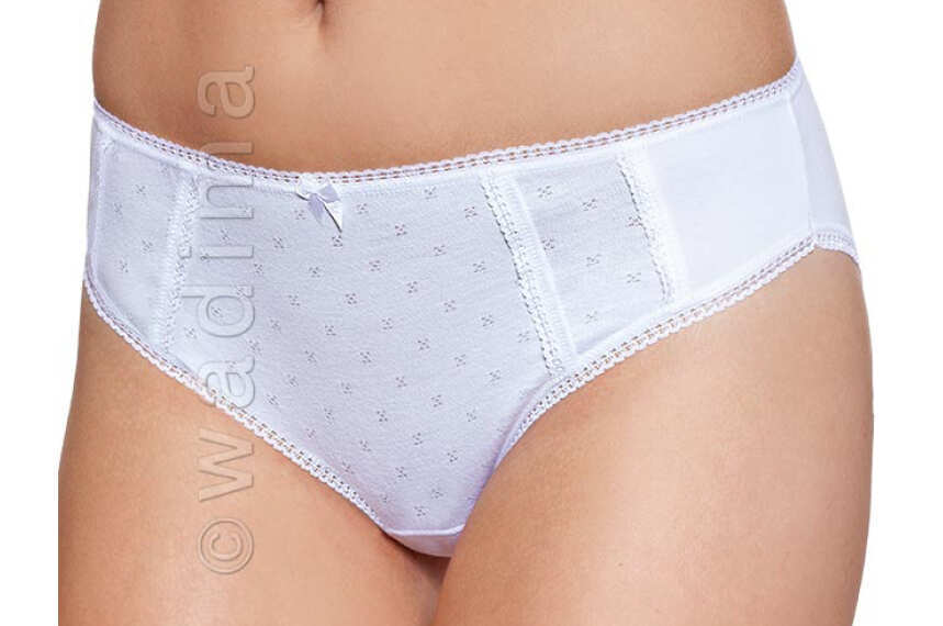 Figi niższe w stanie od 100102. Z przodu z żakardową wstawką, tj. materiałem o delikatnym wzorze. W pasie, zakładkach z przodu i nogawkach wszyta cienka, połyskująca gumka. Z przodu atłasowa kokardka. W połączeniu z podkoszulkiem 10253 tworzą bardzo ładny komplet.
