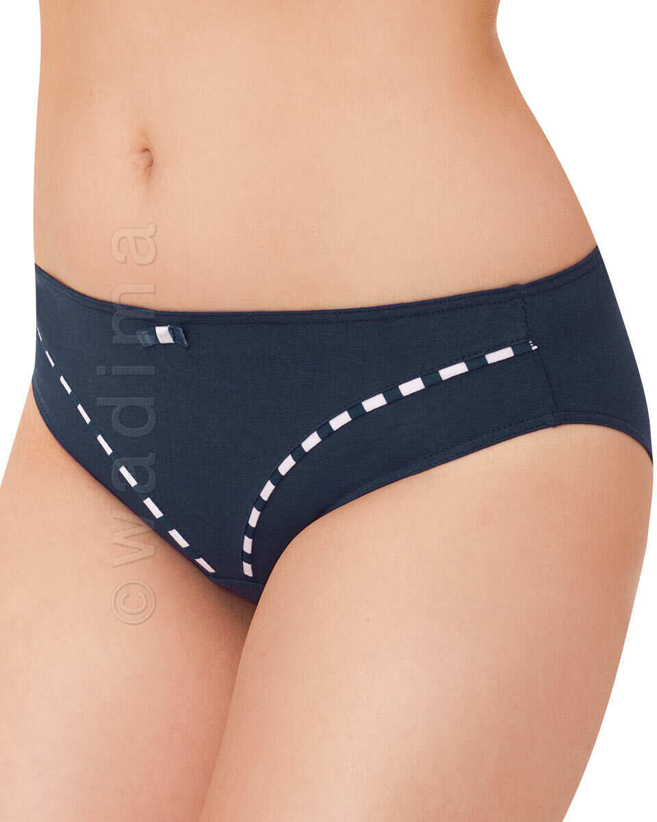 Brzegi pasa i nogawek podwinięte i przeszyte elastycznymi nićmi. Z obu stron przodu w biało-granatowe paseczki, wąskie wypustki, łukiem schodzące ku dołowi. Po środku mała satynowa, granatowa kokardka z białym środkiem. Trwałe i praktyczne. Razem z podkoszulkiem 10274 tworzą bardzo ładny komplet bielizny damskiej.