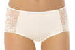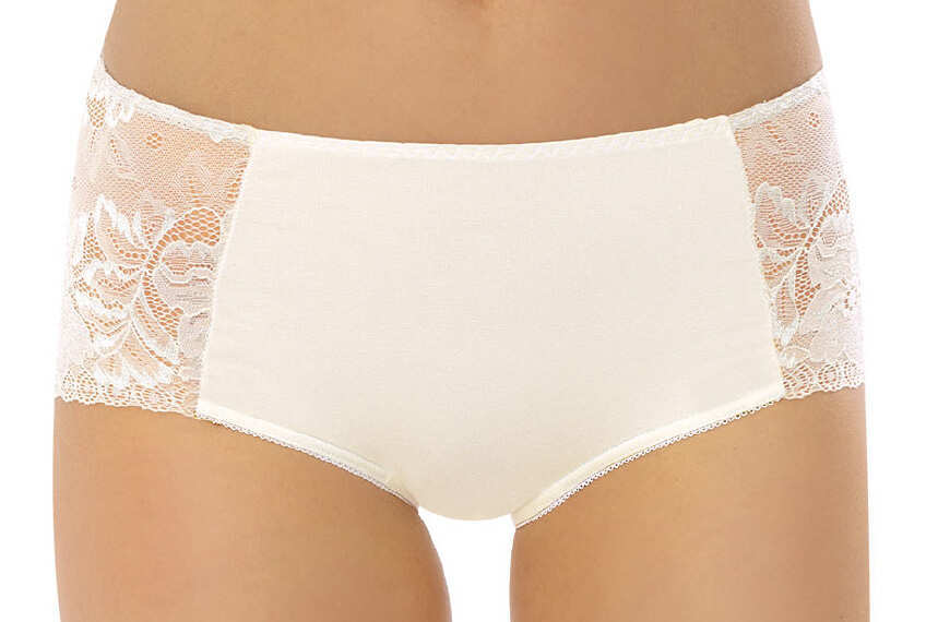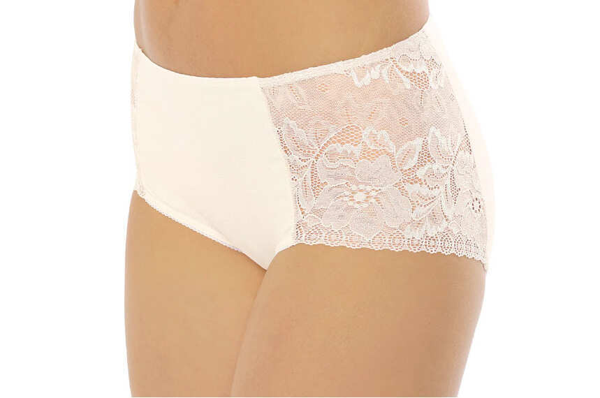 Wysokie w stanie; z pięknymi, koronkowymi wstawkami po bokach. Wykonane z połączenia naturalnej, tzw. wiskozy modal oraz najwyższej jakości bawełny z elastanem, dzięki czemu mięsiste, miękkie, sprężyste, wygodne w użytkowaniu i miłe dla ciała.