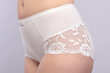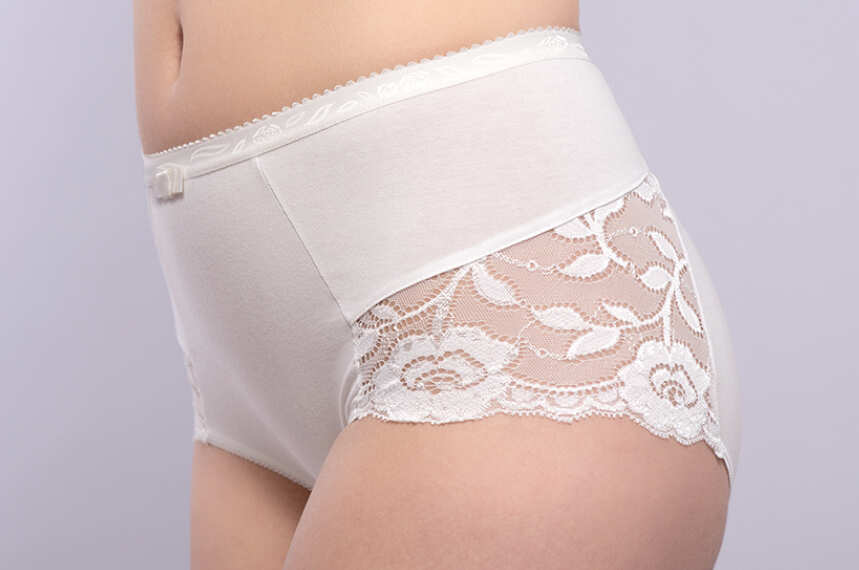 W stylu retro; z efektownymi, połyskującymi, koronkowymi wstawkami po bokach. Bardzo dobrej jakości; wykonane z połączenia wysokogatunkowej bawełny z nadającym dzianinie sprężystości elastanem.