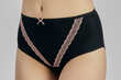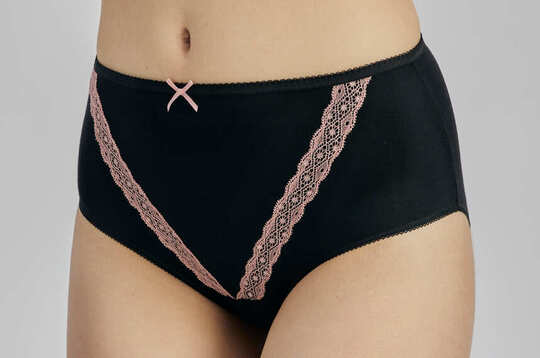 Wysokie w stanie, z naszytą w literę V kontrastową, jasnoróżową koronką na przodzie. Wykonane z połączenia najlepszej jakości bawełny z niewielką ilością nadającego dzianinie sprężystości elastanu.