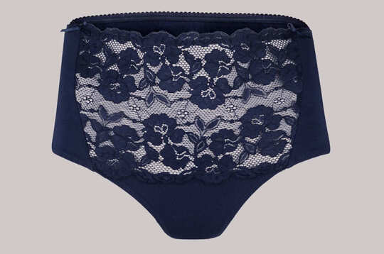 Przód dekoracyjny, z bardzo szeroką, koronkową wstawką w tym samym kolorze. Z obu boków mała, satynowa kokardka. Nogawki wykończone podwinięciem i przeszyte zygzakowym ściegiem. W kolekcji zaliczane do bielizny "z górnej półki". Z koszulą nocną 104799 tworzą bardzo ładny komplet eleganckiej bielizny damskiej.