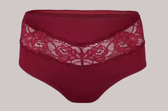 Wysokie w stanie; z ozdobną, koronkową wstawką na przodzie. Wykonane z połączenia najwyższej jakości bawełny z niewielką domieszką elastanu, dzięki czemu ładnie dopasowują się do ciała, są miękkie i przyjemne w dotyku.