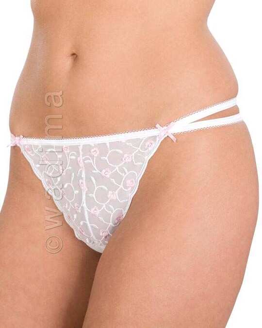 Przód wykonany ze sprężystego tiulu z wyhaftowanym, ładnym wzorem. Białe figi z jasnoróżowymi kwiatuszkami i satynowymi kokardkami po bokach i z tyłu. Gumka dekoracyjna, połyskująca, po bokach i z tyłu podwójna. Bardzo ładnie się prezentują, a z podkoszulkiem-topem 10228, tworzą ładny, kobiecy komplet bieliźniany.